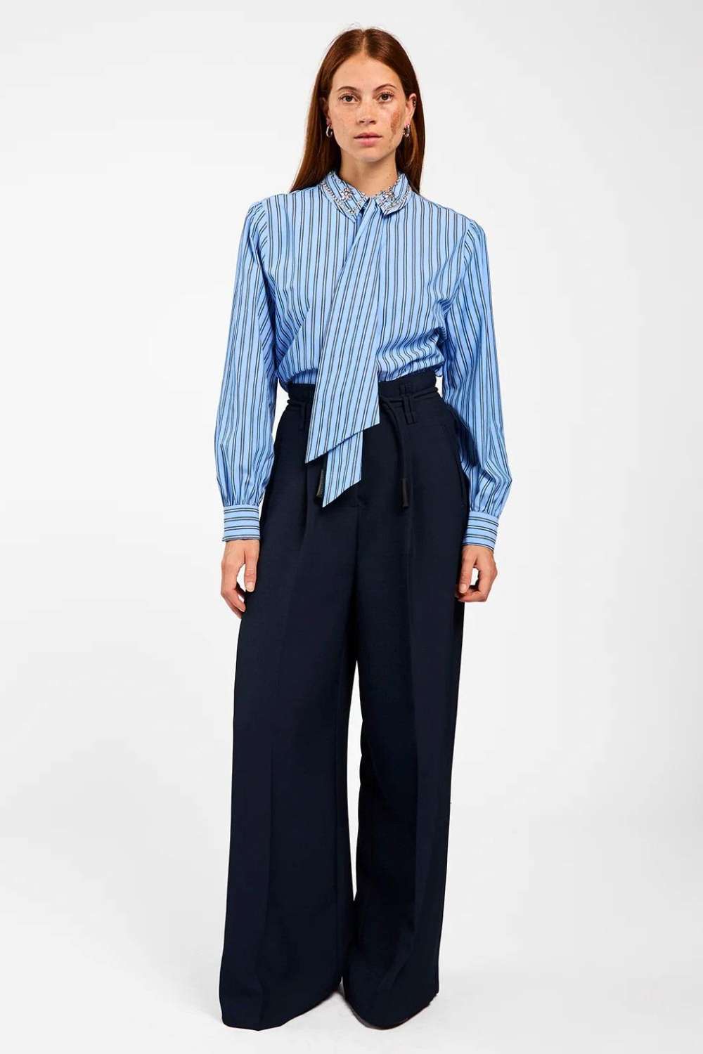 Deze chique blauwe blouse van Aaiko is een elegante toevoeging aan je garderobe. De blouse heeft een traditioneel streepjespatroon met een opvallende strikkraag, wat voor een verfijnde uitstraling zorgt. Gemaakt van 50% katoen en 50% polyester, biedt het een comfortabele pasvorm dankzij de regular fit. De knoopsluiting en puntkraag zijn subtiele details die je outfit compleet maken. Het strass detail aan de kraag voegt een vleugje glamour toe, perfect voor speciale gelegenheden of een stijlvolle zakelijke bijeenkomst.