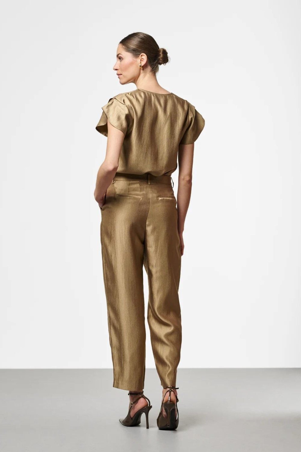 Deze chique damesbroek van Aaiko is een verfijnde keuze voor de lente. De glanzende gouden stof geeft de broek een luxueuze uitstraling en de barrel pasvorm zorgt voor een comfortabele, maar stijlvolle look. Met een high waist ontwerp en een klassieke knoop- en ritssluiting, biedt deze broek zowel modebewustzijn als gemak. De steekzakken voegen praktische details toe en maken het geheel af. De broek is ideaal voor verschillende gelegenheden, van een formele kantoordag tot een feestelijke bijeenkomst. Combineer hem met een elegante blouse en hoge hakken voor een avondje uit, of draag hem met een casual top voor een meer ontspannen look. De normale lengte maakt het gemakkelijk om te combineren met verschillende schoenen, waardoor je deze broek moeiteloos aan je garderobe toevoegt. Geef je outfit een chique touch met deze veelzijdige broek van Aaiko.