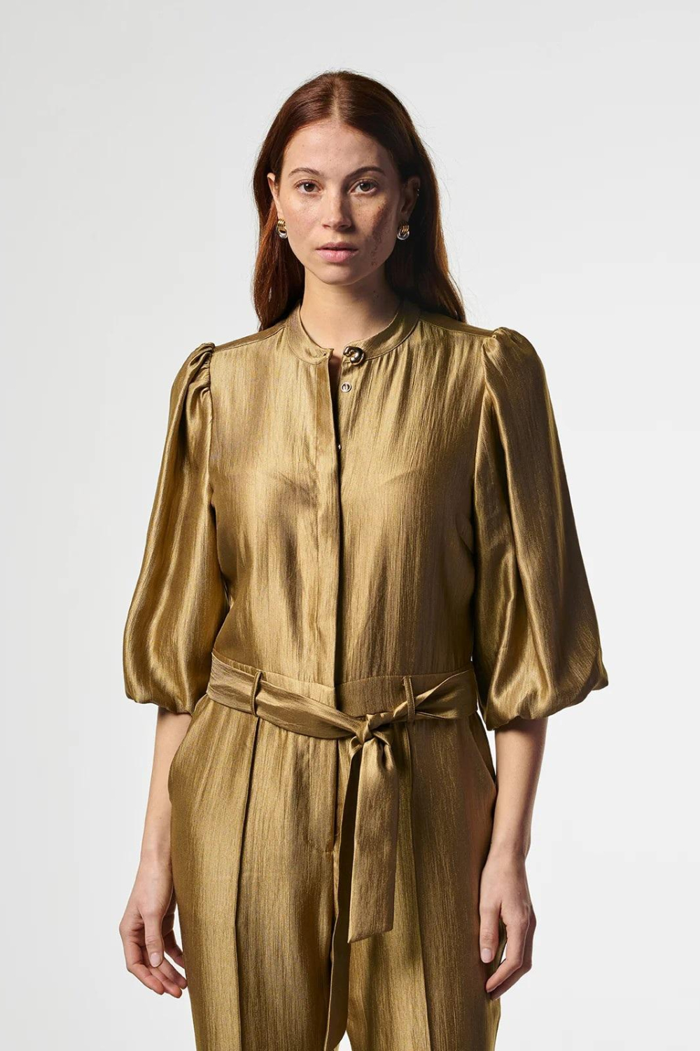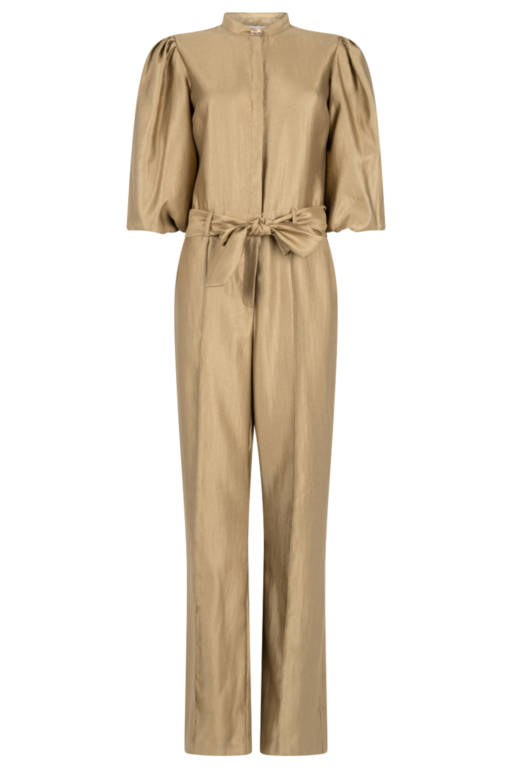 Deze chique jumpsuit van Aaiko combineert moeiteloos stijl en comfort. De prachtige gouden glans geeft het geheel een luxe uitstraling, terwijl de reguliere pasvorm en de normale lengte zorgen voor een flatterend silhouet. Met een ronde hals en een subtiele blinde knoopsluiting straalt deze jumpsuit eenvoud uit. De steekzakken voegen een praktisch element toe, waardoor je het ideale kledingstuk in handen hebt voor zowel formele als ontspannen gelegenheden. De 3/4 mouwen geven een elegante touch, perfect voor het lente seizoen. Deze jumpsuit is de ideale keuze voor een speciale gelegenheid of een avondje uit, en laat zich gemakkelijk combineren met zowel hakken als sandalen. Of je nu naar een bruiloft gaat of een chique etentje hebt, deze Aaiko jumpsuit biedt een tijdloze en verfijnde look die je altijd stijlvol laat voelen.