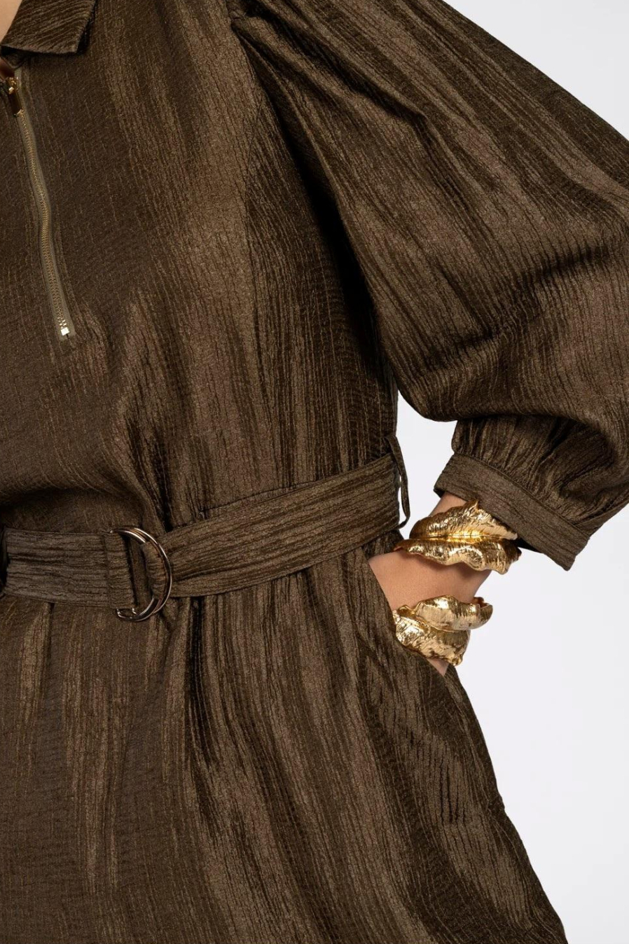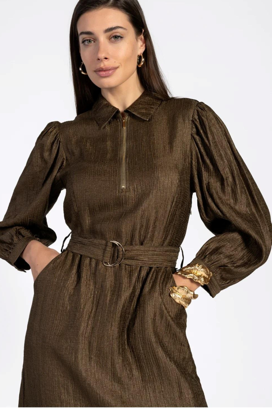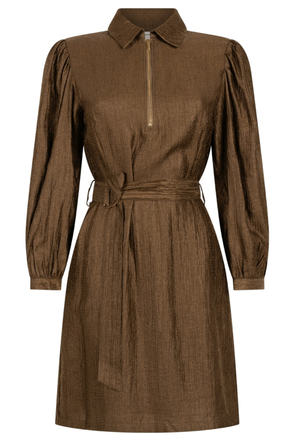 Deze chique jurk van Aaiko is een prachtige toevoeging aan je wintergarderobe. De jurk heeft een verfijnde structuur en is gemaakt van 65% viscose en 35% polyamide, wat een mooie mix van comfort en luxe biedt. De halflange lengte en 3/4 mouwen geven het een elegante uitstraling, terwijl de opvallende goudkleurige ritssluiting aan de voorkant zorgt voor een stijlvol accent. De puntkraag voegt een klassiek element toe, perfect voor een formele gelegenheid of een avondje uit.