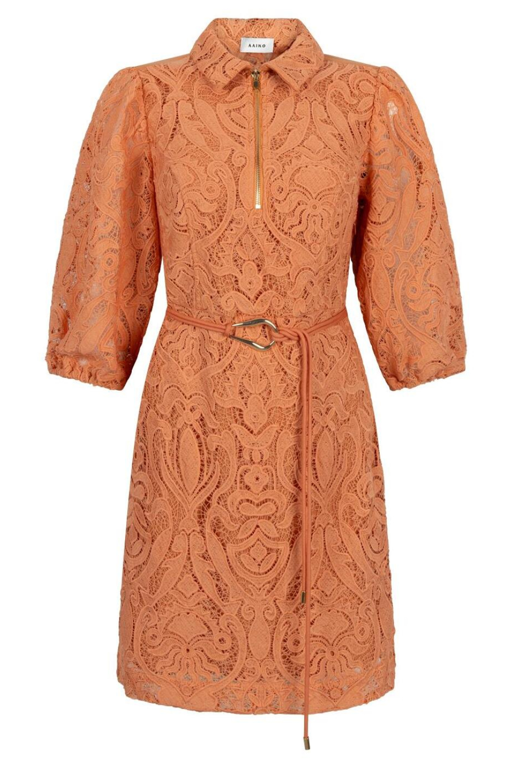Deze elegante halflange jurk van Aaiko is een prachtige keuze voor de lente. Met de opvallende kantpatroon en warme oranje tint straalt deze jurk een casual stijl uit die toch verfijnd oogt. De 3/4 mouwen geven het een luchtig gevoel, terwijl de regular fit zorgt voor een comfortabele pasvorm. De blinde ritssluiting aan de voorzijde onderstreept de gestroomlijnde look, terwijl de puntkraag een klassieke touch toevoegt. Gemaakt van 100% polyester en voorzien van een zachte viscose voering, biedt deze jurk jou comfort voor verschillende gelegenheden. Of je nu een casual dagje in de stad doorbrengt of een informeel evenement bezoekt, deze jurk is ideaal. De stijlvolle ceintuur accentueert de taille subtiel, wat de jurk een extra vrouwelijke uitstraling geeft. Combineer het met je favoriete sandalen of hakken voor een complete look die zowel modieus als tijdloos is. Meer informatie: De totale lengte is 93 cm bij maat S.