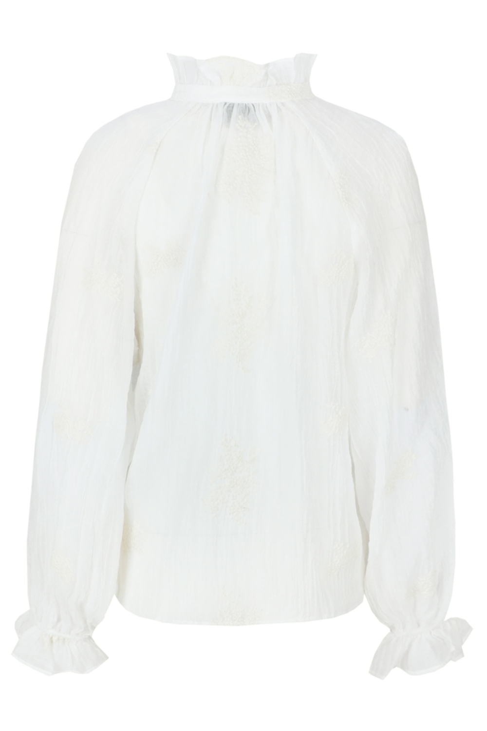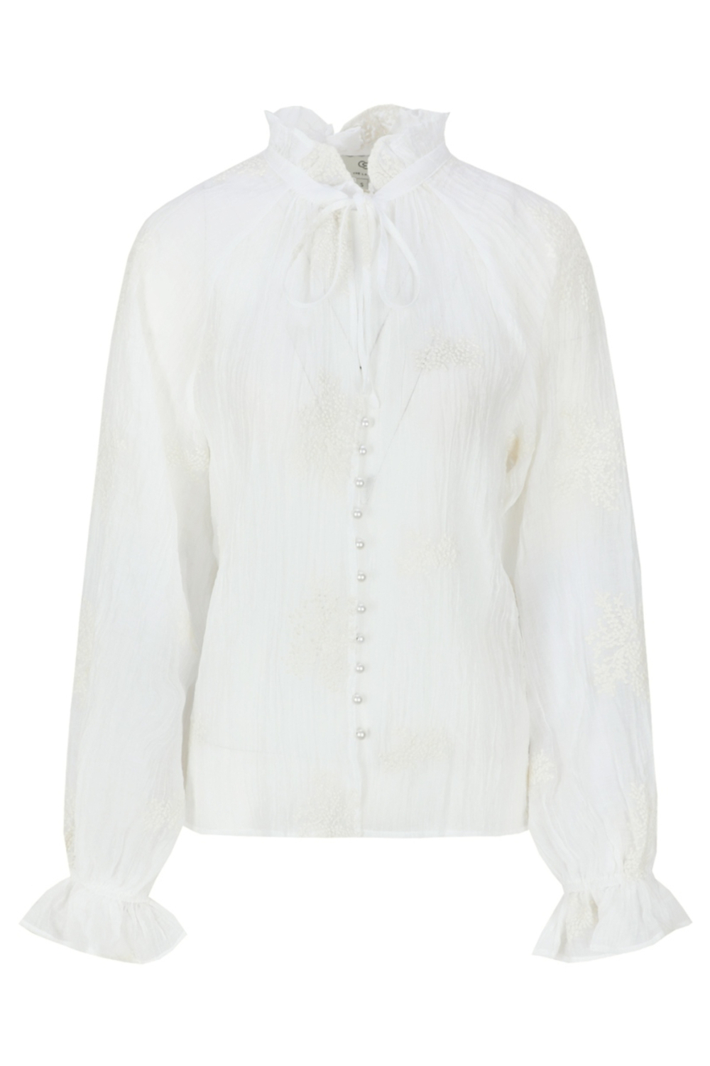 Deze charmante offwhite blouse van C&S The Label is een waardevolle aanvulling op je kledingkast. Het transparante ontwerp met subtiele structuur en ronde hals straalt elegantie uit, terwijl de knoopsluiting met sierlijke pareldetails een verfijnde touch toevoegt. De blouse biedt een comfortabele regular fit dankzij de lichte en ademende polyester stof, ideaal voor het lenteseizoen. Of je nu een dag op kantoor doorbrengt of een casual lunch gepland hebt, deze blouse past perfect bij elke gelegenheid. De lange mouwen met speelse ruches aan de polsen maken het een veelzijdige keuze die je zowel met een elegante pantalon als met een casual jeans kunt combineren. De delicate bloemenpatronen zorgen voor een subtiele, vrouwelijke uitstraling die je look compleet maakt. Deze blouse is een stijlvolle keuze voor elke dag.