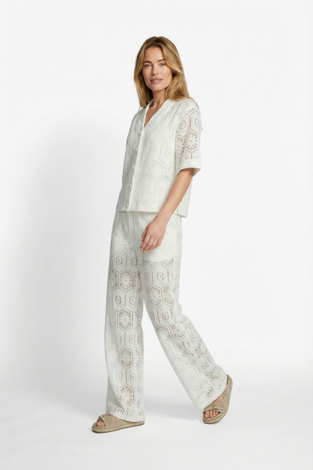 Deze elegante ecru blouse van C&S The Label is een veelzijdige toevoeging aan je zomergarderobe. Gemaakt met aandacht voor detail, bezit deze blouse een charmant kantpatroon dat zacht en luchtig aanvoelt door het gebruik van 50% katoen en 50% polyamide. De regular fit en korte mouw zorgen voor een ontspannen pasvorm, ideaal voor warme zomerdagen. De V-hals en knoopsluiting geven het kledingstuk een tijdloze uitstraling, terwijl het lichte kantpatroon zorgt voor een modern tintje. Of je nu een dagje uit plant of een informele bijeenkomst bijwoont, deze blouse is de perfecte keuze. Combineer hem met een lichte jeans of een stijlvolle zomerse broek voor een moeiteloze, chique look. De blouse is ontworpen om je comfort te bieden zonder in te boeten aan stijl. Met zijn normale lengte en verfijnde afwerking past deze blouse bij iedere gelegenheid, van casual tot semi-formeel. Voeg een paar sandalen of hakken toe, en je bent klaar om de dag stijlvol te beginnen.