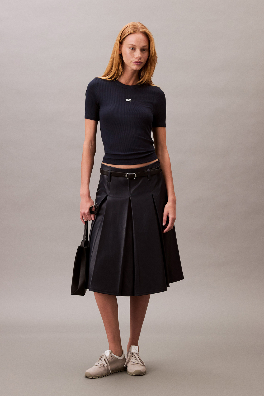 Dit navy T-shirt van Calvin Klein is een stijlvolle toevoeging aan je casual garderobe. Het heeft een slanke pasvorm die je look direct een moderne twist geeft, perfect voor de herfst. De ribstructuur draagt bij aan een eigentijdse uitstraling, terwijl de ronde hals en korte mouwen zorgen voor een ontspannen en toch nette look. Gemaakt van 91% modal en 9% elastan, biedt dit T-shirt zowel zachtheid als flexibiliteit, waardoor het comfortabel is om de hele dag te dragen. Dit T-shirt is veelzijdig en kan gemakkelijk gecombineerd worden voor verschillende gelegenheden. Draag het met een nette broek voor een semi-formele look, of ga voor een relaxte uitstraling met een jeans. Het subtiele Calvin Klein logo op de borst voegt een verfijnd detail toe dat spreekt van luxe en eenvoud. Of je nu een dag op kantoor doorbrengt of een informele bijeenkomst hebt, dit T-shirt is een betrouwbare keuze die je stijlvol door elke situatie loodst.