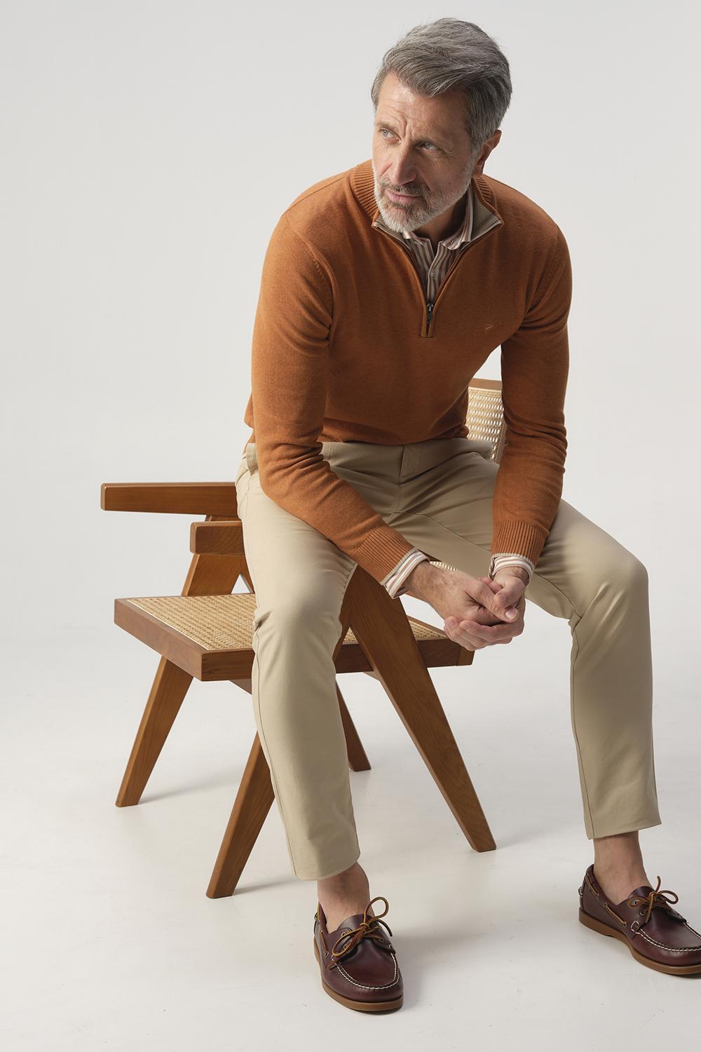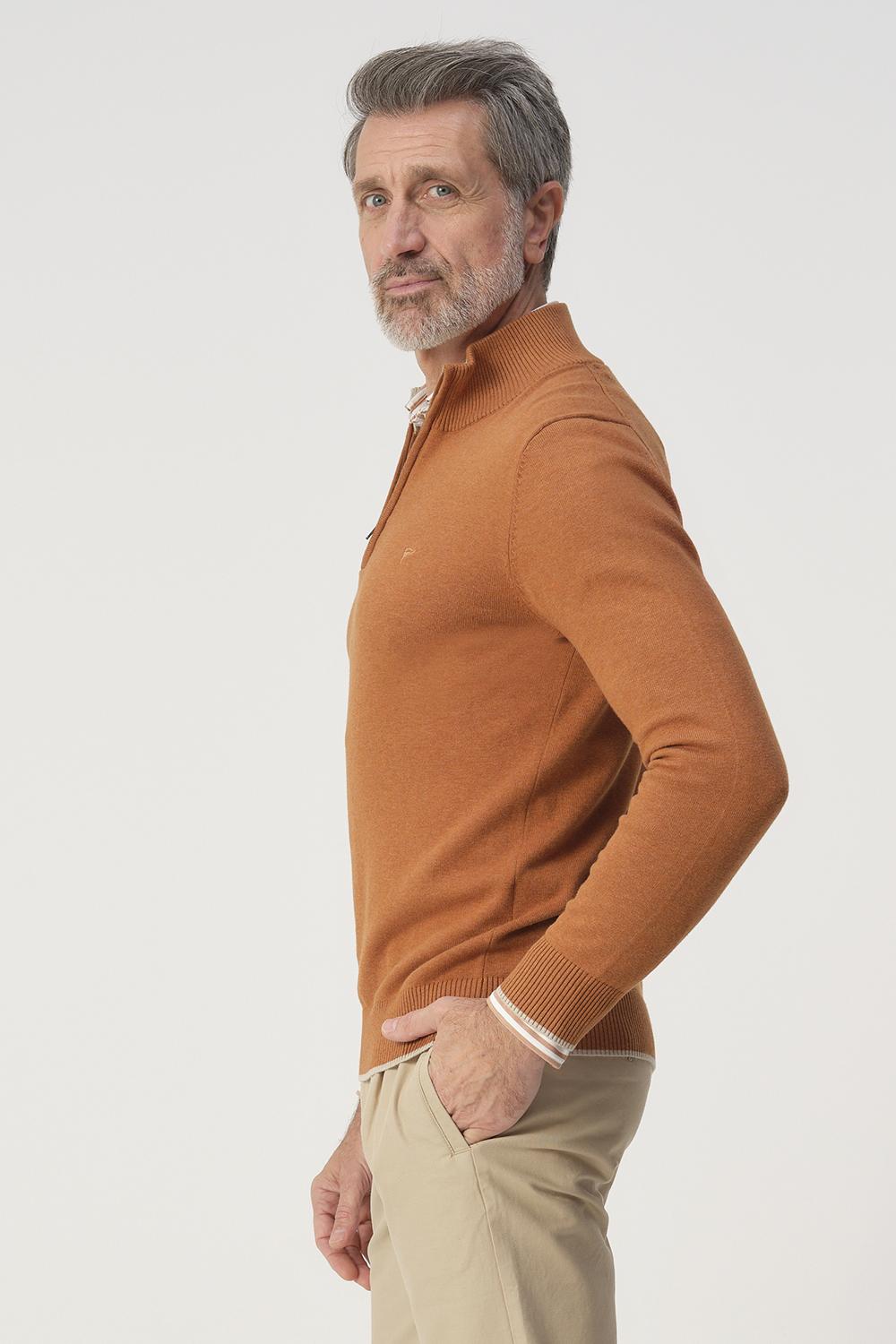 Deze Campbell trui is een ideale aanvulling op je lentegarderobe. De gemêleerde knitwear van 87% katoen, 11% polyamide en 2% elastan combineert comfort met een luxe uitstraling. Dankzij de regular fit pasvorm en de normale lengte past de trui zich moeiteloos aan jouw dagelijkse stijl aan. De klassieke high neck met ritssluiting biedt zowel praktische flexibiliteit als een verfijnde look, een perfecte keuze voor informele of nettere gelegenheden. De warme, aardetint van deze trui geeft een zachte, maar toch opvallende uitstraling die makkelijk te combineren is met diverse kleuren en stijlen. Of je nu kiest voor een casual jeans of een nette pantalon, deze trui behoudt altijd zijn stijlvolle karakter. Het subtiele Campbell-logo op de borst voegt een hint van exclusiviteit toe. Ideaal voor zowel een zakelijke bijeenkomst als een zonnige dag in de stad. Deze trui is jouw partner in stijlvolle veelzijdigheid voor elke gelegenheid.