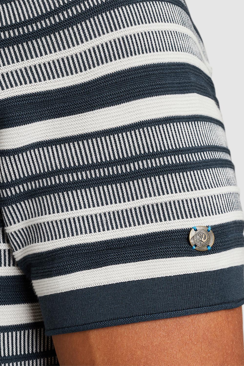 Deze Cast Iron polo is een stijlvolle keuze voor de lente. Met een regelmatige pasvorm en korte mouwen biedt deze polo een casual en toch verfijnde uitstraling. De strepenpatroon in navy en wit zorgt voor een tijdloze look die eenvoudig te combineren is met andere kledingstukken in je garderobe. De rib kraag en knoopsluiting geven deze polo een klassiek silhouet. Gemaakt van een duurzame mix van 50% katoen en 50% modal, voelt deze polo zacht aan en is hij geschikt voor verschillende gelegenheden. Of je nu een ontspannen dag gepland hebt of iets meer gekleed wil gaan voor een casual zakelijke omgeving, deze polo laat zich makkelijk stylen. Combineer hem met een lichte jeans of een chino voor een complete look. De veelzijdigheid en het comfort van deze Cast Iron polo maken hem tot een waardevolle aanvulling op je kledingcollectie.