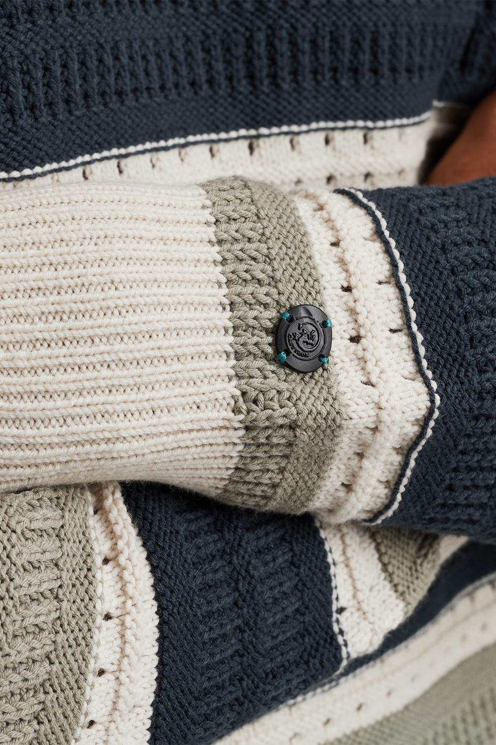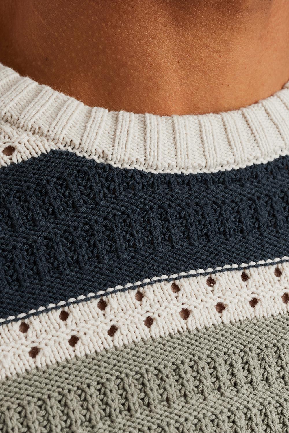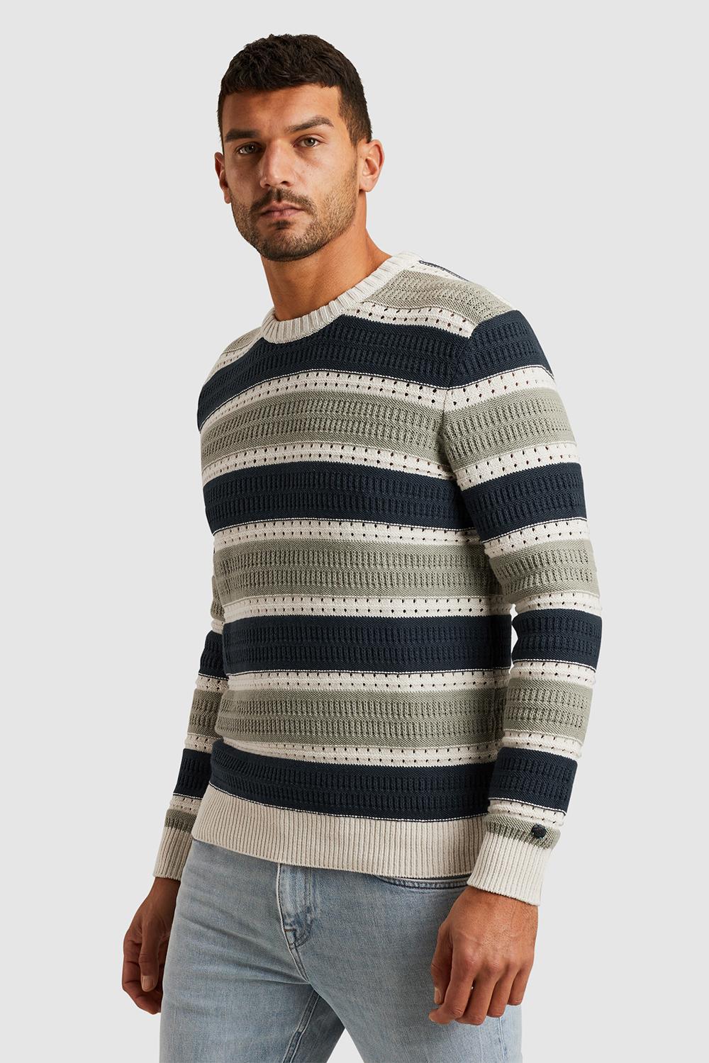 Deze ajour trui van Cast Iron, met zijn regular fit en moderne uitstraling, is een veelzijdige keuze voor jouw lentegarderobe. De trui is gemaakt van een comfortabele mix van 60% katoen en 40% acryl, waardoor hij zowel zacht als duurzaam aanvoelt. Het karakteristieke streeppatroon in neutrale tinten zoals navy, beige, en olijf, geeft je look een stijlvolle touch zonder te overheersen. De ronde halslijn en lange mouwen maken het een ideaal kledingstuk voor koelere lentedagen. Deze Cast Iron trui is perfect om te combineren met een lichte jeans voor een casual dagje uit, of draag hem met een chino voor een smart-casual outfit naar kantoor. De gedetailleerde knitwear structuur voegt een extra laag van verfijning toe, waardoor je met deze trui eenvoudig een statement maakt. Of je nu gaat voor een dagje in de stad of een ontspannen avondje thuis, deze trui past zich moeiteloos aan jouw plannen aan.