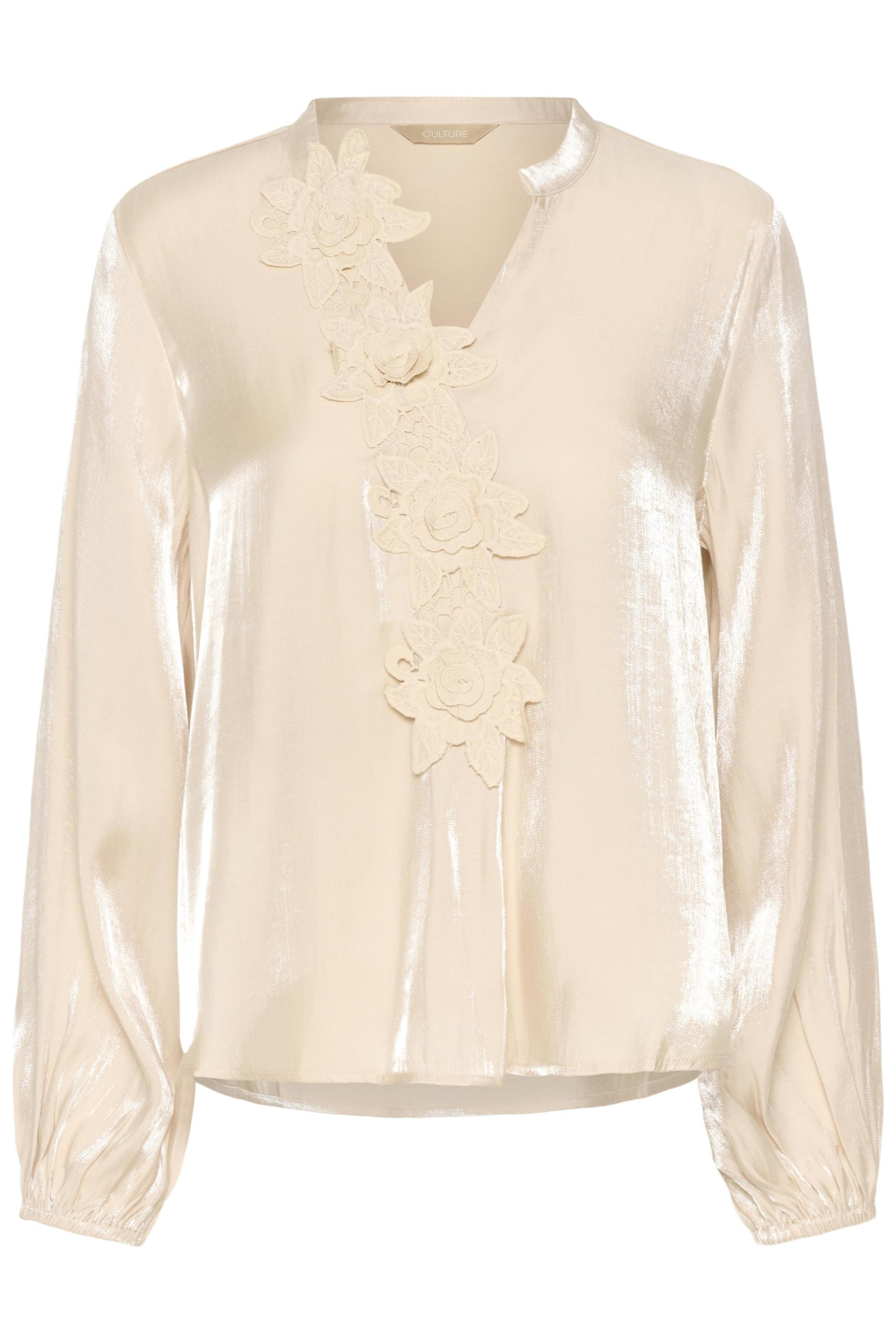 Deze elegante blouse van Culture is een verfijnde aanvulling op je garderobe. De champagnekleurige blouse heeft een subtiele glans dankzij de mix van 60% viscose en 40% polyester, die zowel stijl als comfort biedt. De V-hals en de prachtige bloemenapplicaties op de borst geven de blouse een unieke uitstraling. Met zijn regular fit en normale lengte zit deze blouse uiterst comfortabel en valt hij mooi om het lichaam. De lange mouwen met elastische boorden zorgen voor een klassieke, maar casual look, perfect voor allerlei gelegenheden. Of je nu een dagje op kantoor hebt, naar een etentje gaat of een informele bijeenkomst bijwoont, deze blouse is een veelzijdige keuze. Draag hem met een nette pantalon voor een meer formele look, of combineer hem met jeans voor een relaxte, stijlvolle outfit. Deze Culture blouse is een tijdloos stuk dat je keer op keer uit de kast zult pakken.