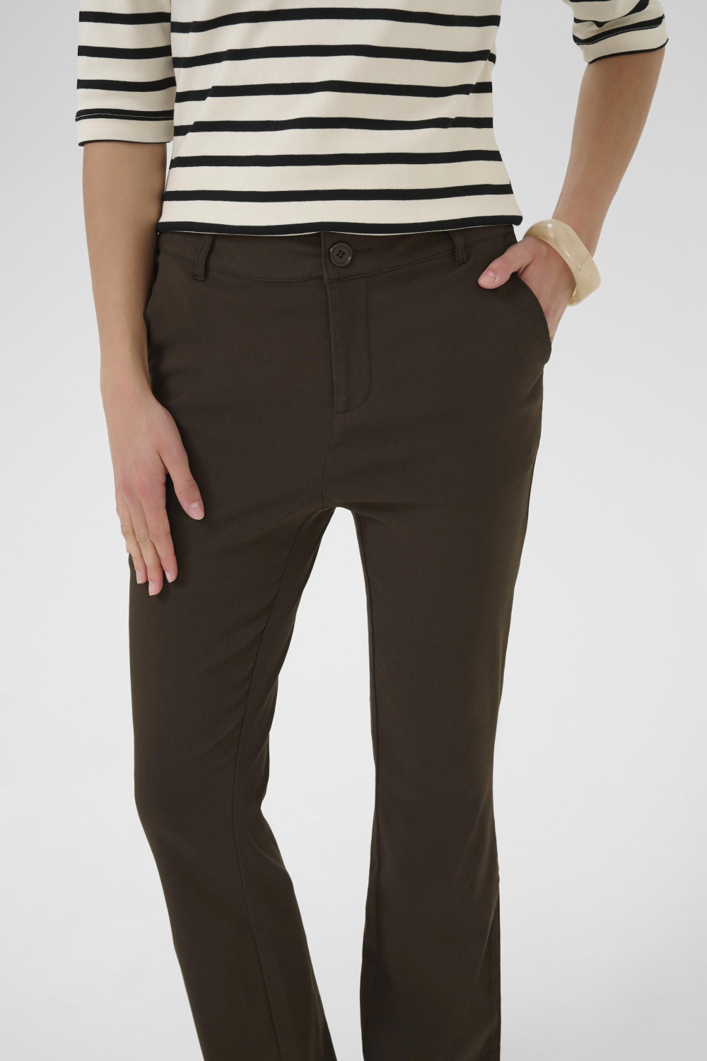 Deze stijlvolle flared broek van Culture is een veelzijdige keuze voor jouw herfstgarderobe. De broek is uitgevoerd in een rijke, diepbruine kleur en heeft een regular waist die zorgt voor een comfortabele pasvorm. Dankzij de steekzakken biedt de broek zowel stijl als functionaliteit. De knoop- en ritssluiting maken het geheel af, waardoor je met gemak een elegante en toch casual uitstraling creëert.