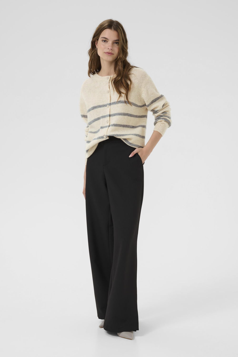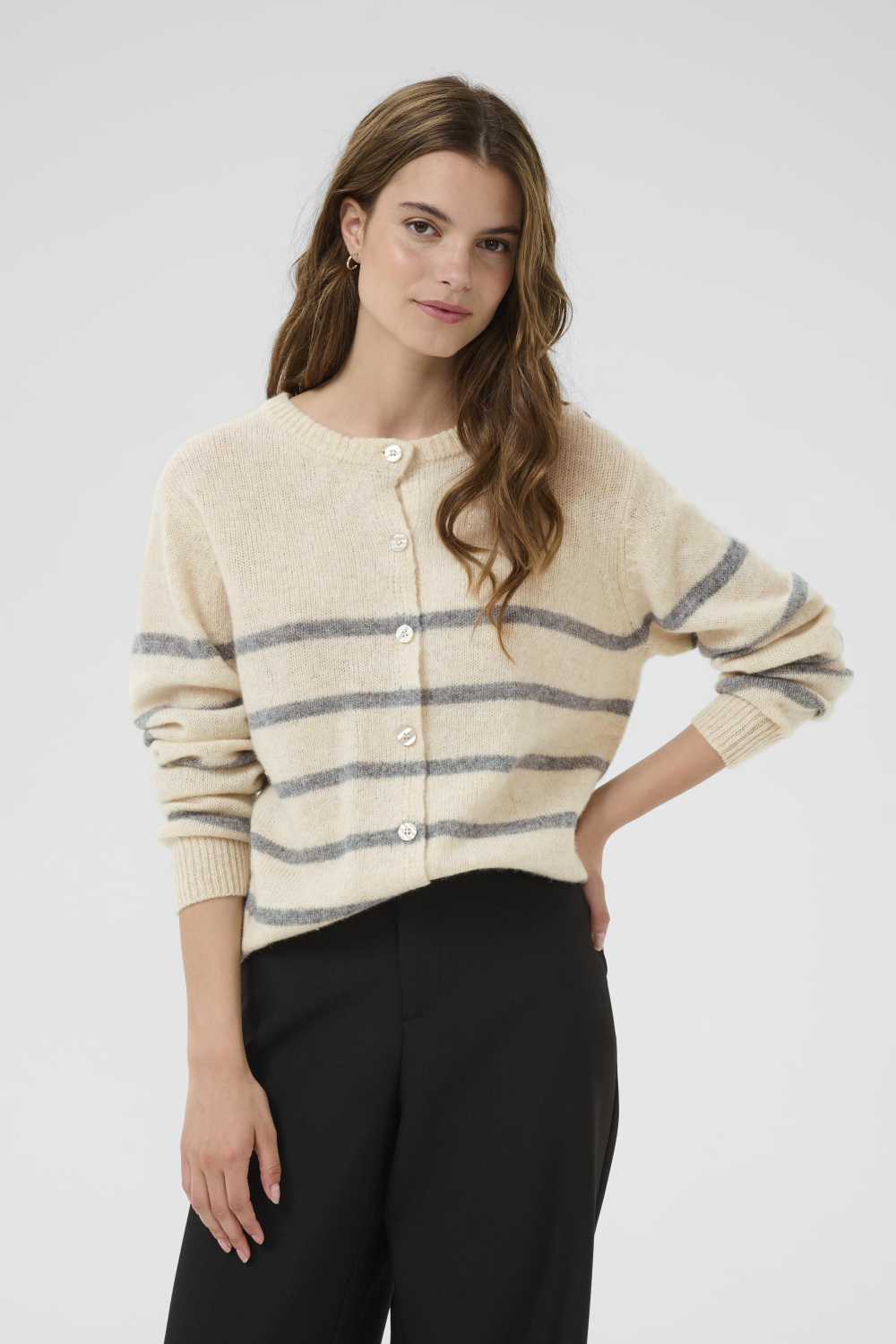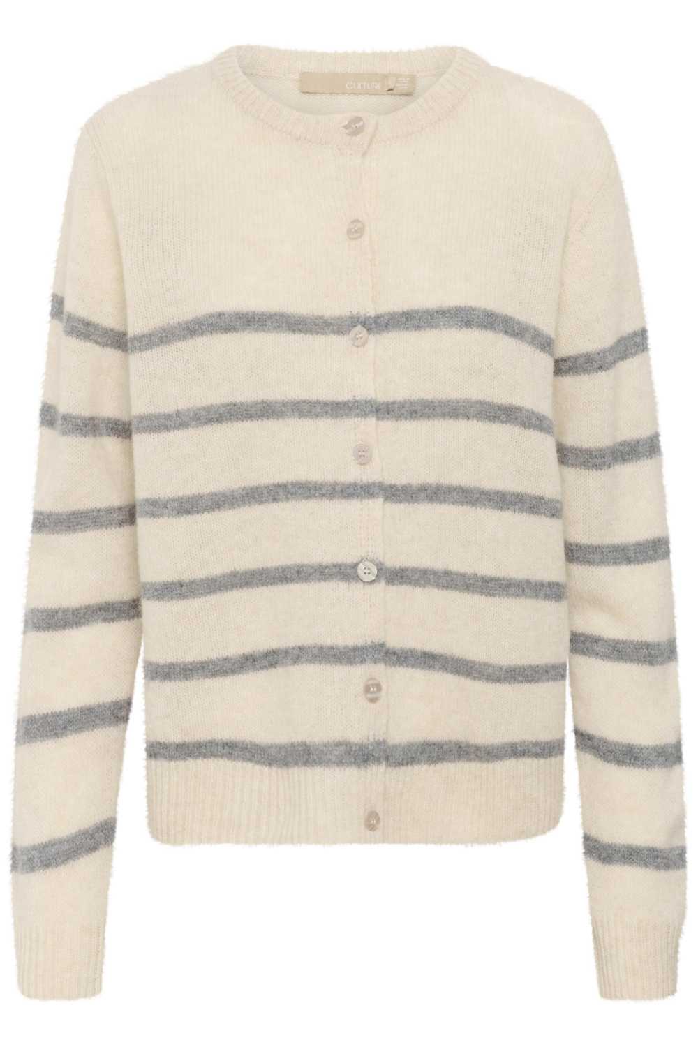 Deze knusse damesvest van Culture is een stijlvolle keuze voor de herfst. Met de zachte whitecap melange en grijze strepen breng jij moeiteloos een vleugje elegantie in je garderobe. De knitwear stijl voelt behaaglijk aan dankzij de 100% wol samenstelling, perfect voor de koudere dagen. De knoopsluiting en reguliere pasvorm maken het een veelzijdig vest dat je zowel op kantoor als tijdens een informeel uitje kunt dragen. Met zijn ronde halslijn en lange mouwen biedt het vest niet alleen comfort, maar ook een tijdloze uitstraling die bij elke gelegenheid past. Draag het op een donkere pantalon voor een klassieke look, of combineer het met een casual jeans voor een ontspannen dag. De gestreepte patroon voegt een speels accent toe, waardoor dit vest een waardevolle toevoeging is aan je kledingcollectie. Een ideale match voor het herfstseizoen waarin stijl en warmte samenkomen.