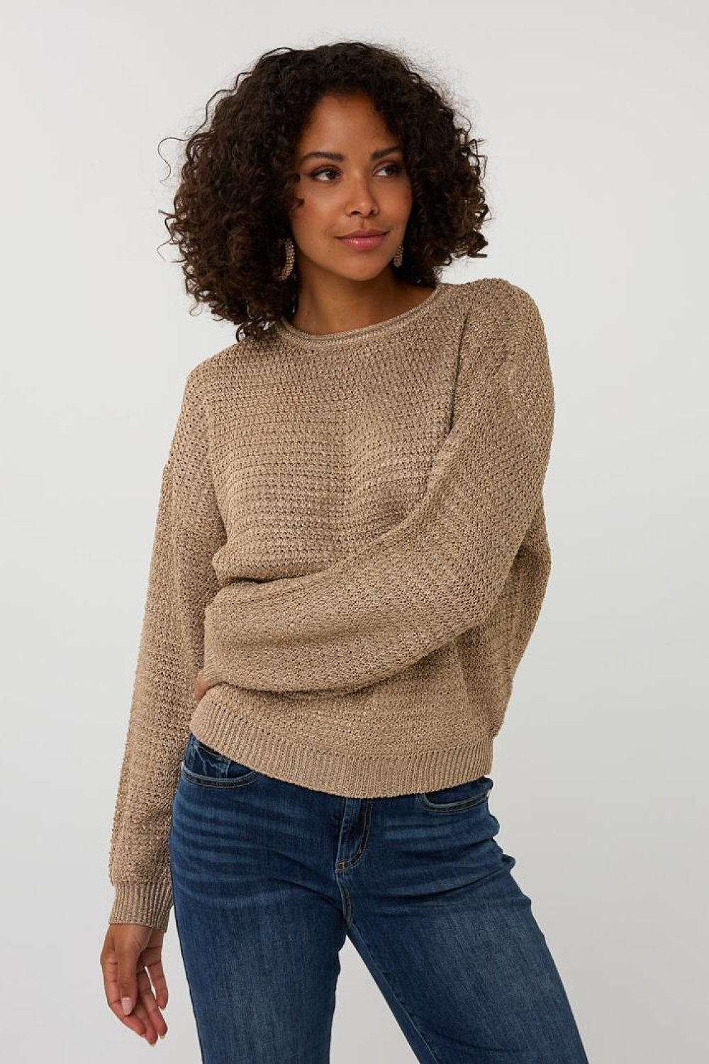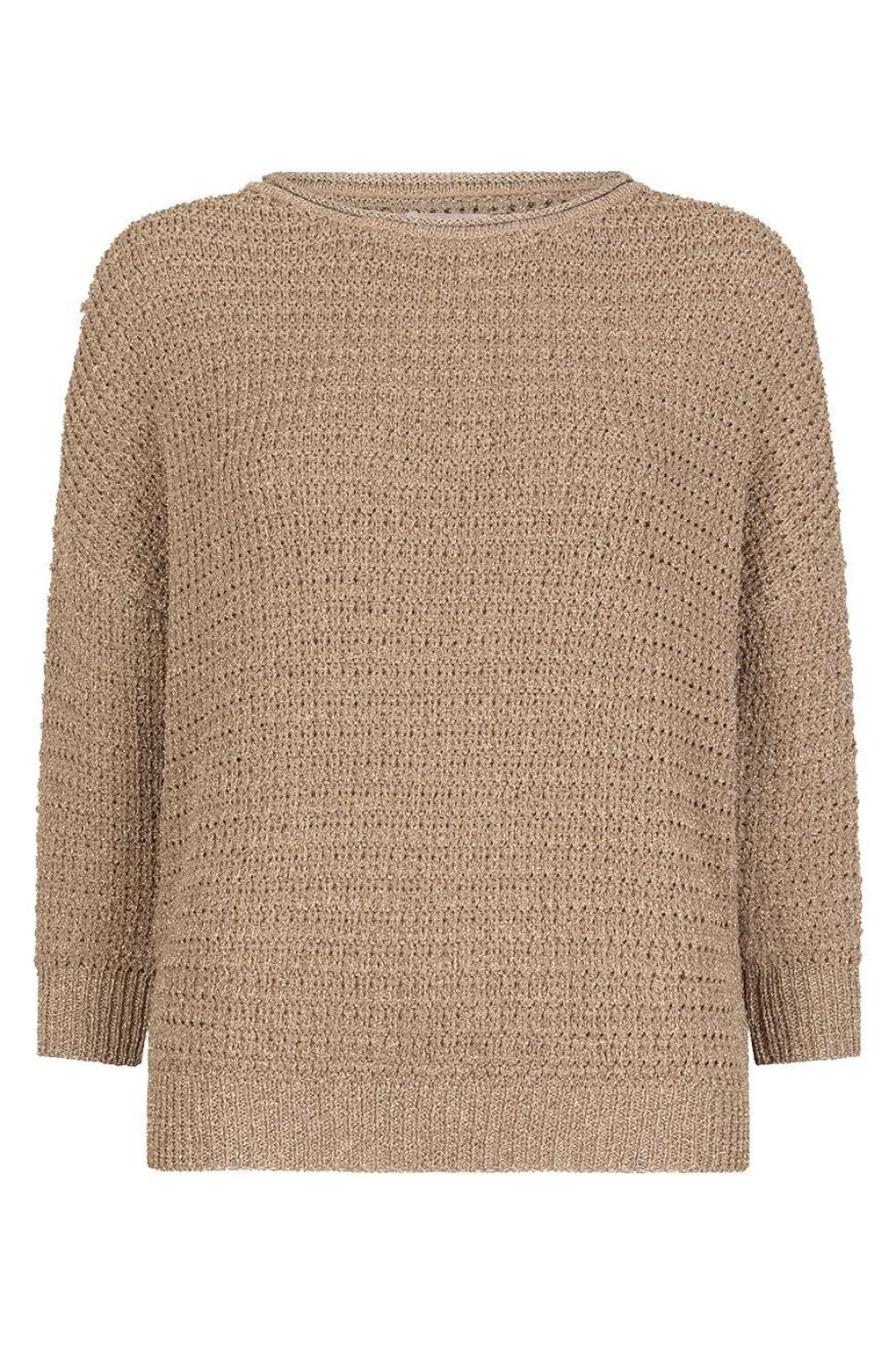 Deze elegante trui van EsQualo is een veelzijdige aanwinst voor je herfstgarderobe. Met zijn oversized pasvorm en ronde hals biedt de trui een casual maar stijlvolle uitstraling. De zandkleurige tint, voorzien van subtiele glitters, geeft een warme en sprankelende touch aan je outfit. Gemaakt met 59% viscose, 21% metaalgaren en 20% polyester, voelt de stof zacht aan op je huid en biedt het een comfortabele fit. De 7/8 mouwen maken het een ideale keuze voor de overgang tussen de seizoenen.