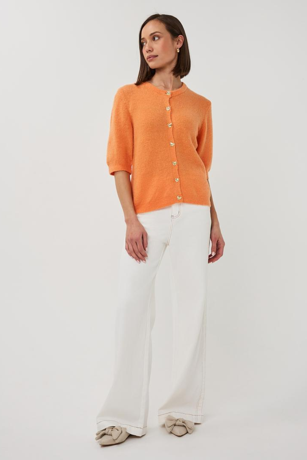Dit vrolijke oranje vest van EsQualo is een prachtige aanvulling op je lente-garderobe. Het vest heeft een ronde hals en een normale lengte, waardoor het een veelzijdige keuze is voor allerlei gelegenheden. Dankzij de korte mouwen is het ideaal voor mildere dagen, terwijl de knoopsluiting met charmante, hartvormige knopen een speelse toets geeft. Met een regular pasvorm en gemaakt in een zachte knitwear-stijl, biedt dit vest comfort en stijl in één.