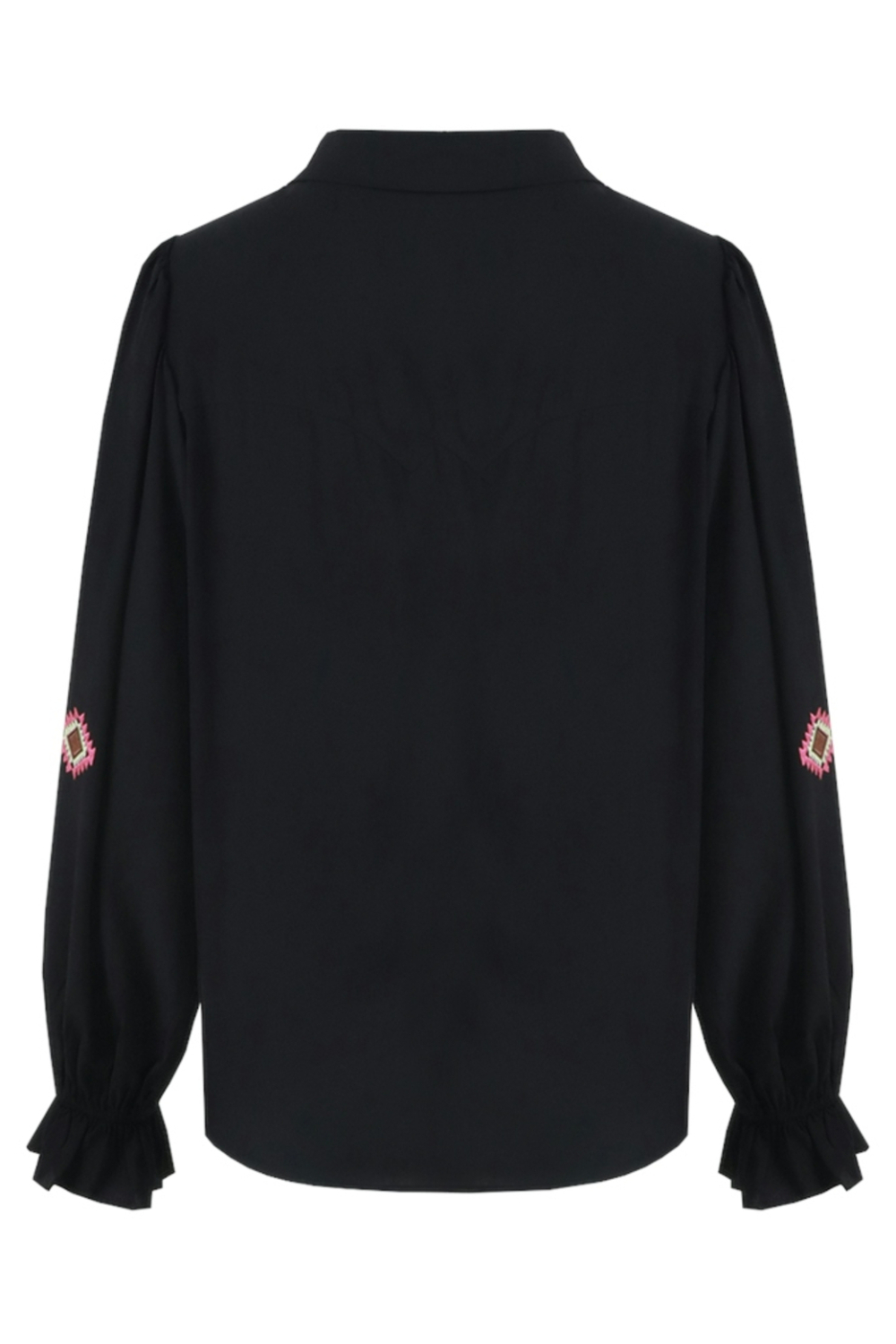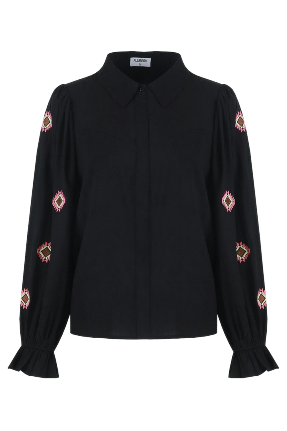 Deze elegante zwarte damesblouse van Fluresk is een perfecte keuze voor een casual herfstdag. Gemaakt van 100% viscose, biedt de blouse een heerlijk zachte en comfortabele feel. Met een regular pasvorm en een klassieke puntkraag levert deze blouse een tijdloze look op, ideaal voor verschillende gelegenheden. De grafische patronen in subtiele kleuren op de lange mouwen geven een speelse touch aan het geheel. De blouse is voorzien van een knoopsluiting en heeft een normale lengte, waardoor deze veelzijdig te combineren is. Perfect voor een informele werkomgeving of een gezellige lunch met vrienden. De kleurrijke patronen op de mouwen maken deze blouse een blikvanger, terwijl de zwarte basiskleur ervoor zorgt dat je hem moeiteloos kunt combineren met andere kledingstukken. Voeg een eenvoudige broek of rok toe voor een complete look.