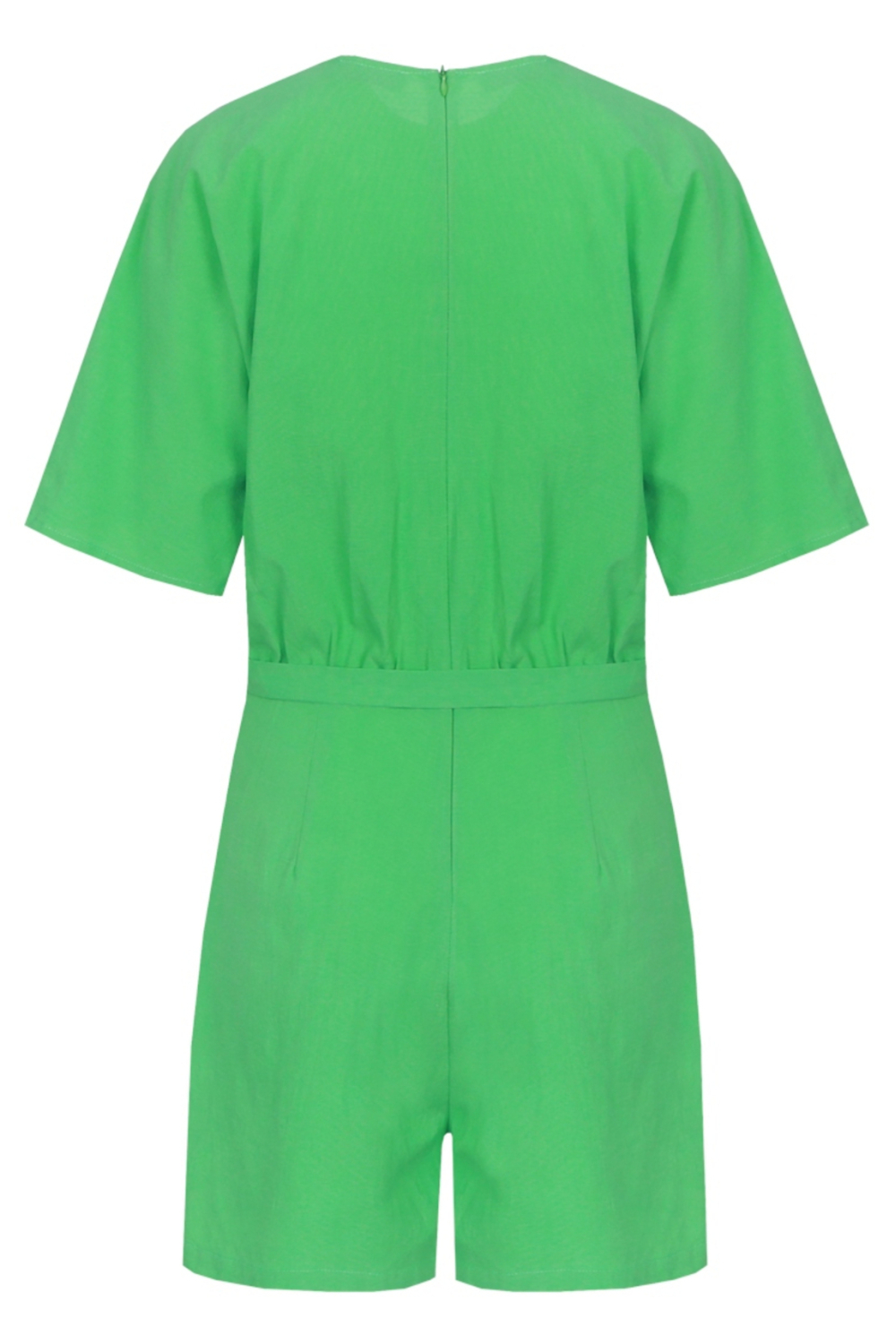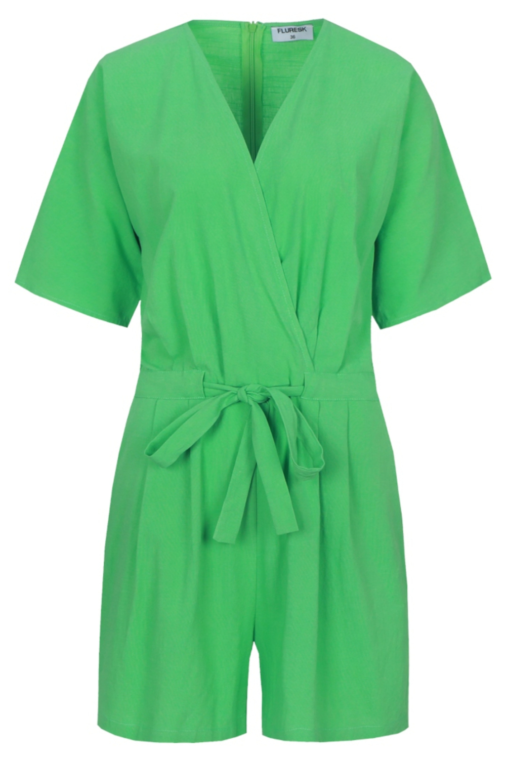 Deze groene jumpsuit van Fluresk is een casual must-have voor de zomer. Het luchtige ontwerp met een overslaghals en korte mouwen straalt eenvoud uit en biedt comfort op warme dagen. De blinde ritssluiting aan de achterkant zorgt voor een strakke afwerking, terwijl de tailleband met strikdetail een subtiele elegante touch toevoegt. Dit kledingstuk, gemaakt van 55% katoen en 45% viscose, combineert ademende eigenschappen met een lichte, vloeiende stof. Met zijn reguliere pasvorm en korte lengte is deze jumpsuit ideaal voor een dagje uit in de stad of een ontspannen strandwandeling. Het frisse groene kleuraccentueert je zomerse gloed en biedt een veelzijdige basis voor allerlei accessoires. Of je hem nu draagt met sandalen of sneakers, deze jumpsuit past zich moeiteloos aan je plannen aan. Voeg een zonnehoed toe om je look compleet te maken voor die zorgeloze zomerdag.