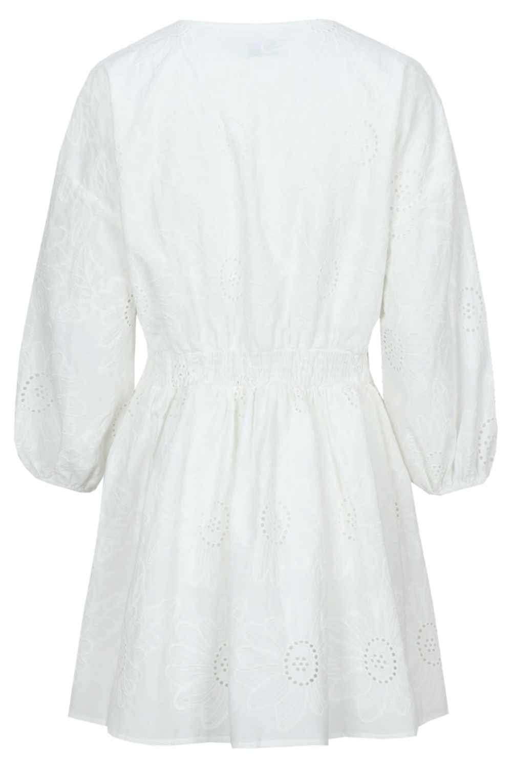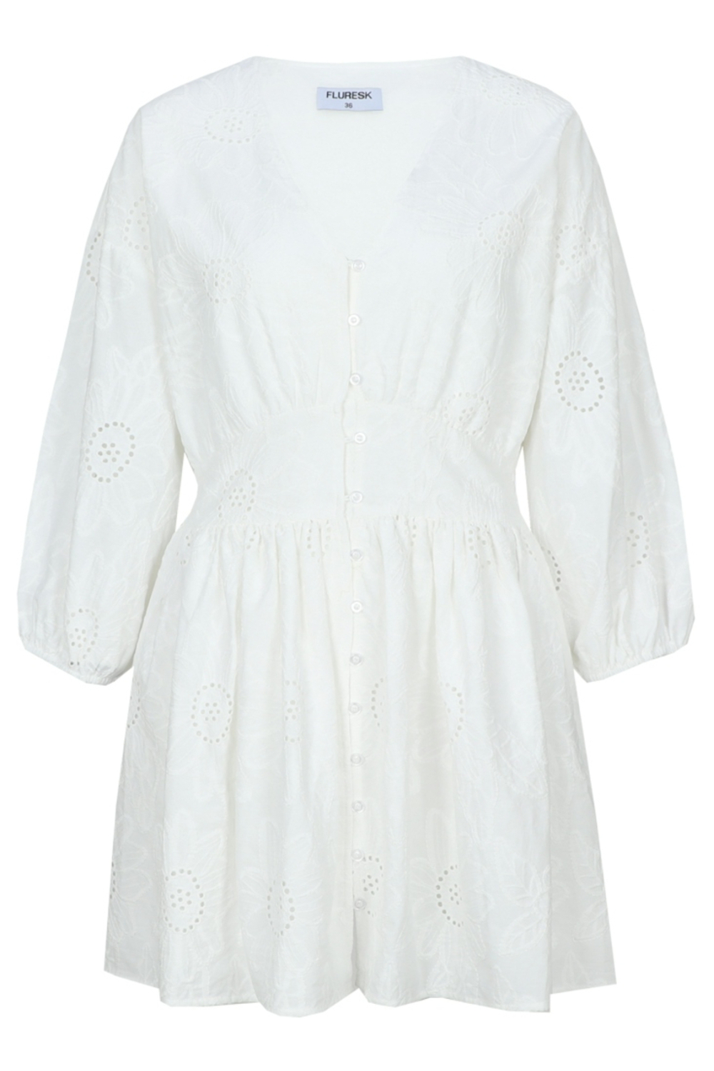 Deze elegante witte jurk van Fluresk is een prachtige keuze voor de zomerse dagen. Met zijn speelse ajourpatroon en V-hals biedt de jurk een luchtige en verfijnde uitstraling. De korte lengte en de flatterende regular fit maken de jurk geschikt voor elke casual gelegenheid, van een strandwandeling tot een zomerse picknick. Het 100% katoenen materiaal zorgt voor ademend comfort, waardoor het ook op warme dagen heerlijk te dragen is. Dankzij de korte mouwen is deze jurk perfect voor de zomer en geeft het je een stijlvolle en moeiteloze look. Combineer de jurk met sandalen voor een ontspannen dagje uit of kleed het geheel af met hakken voor een avondje uit. De verfijnde details zoals het ajourpatroon voegen een subtiele elegantie toe, terwijl de algehele stijl veelzijdigheid biedt. Met deze jurk van Fluresk maak je elke zomerdag net een beetje mooier. Meer informatie: De totale lengte is 86 cm bij maat 36.