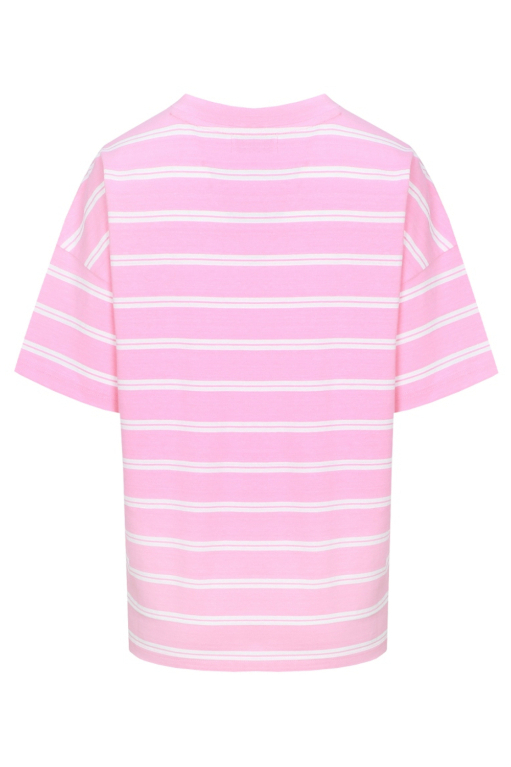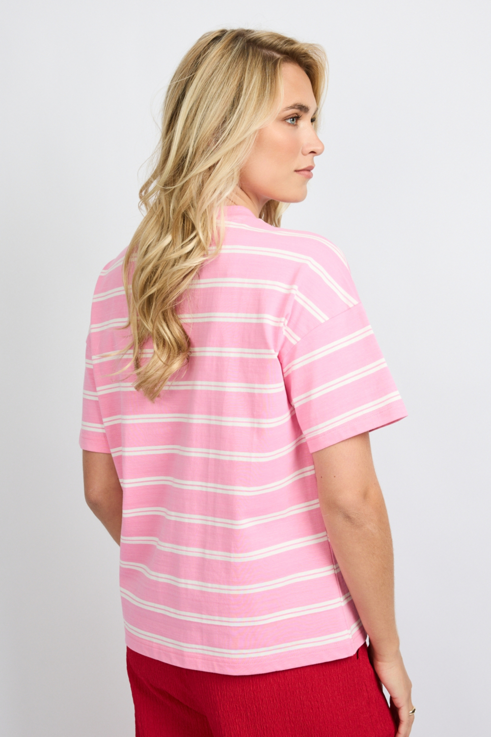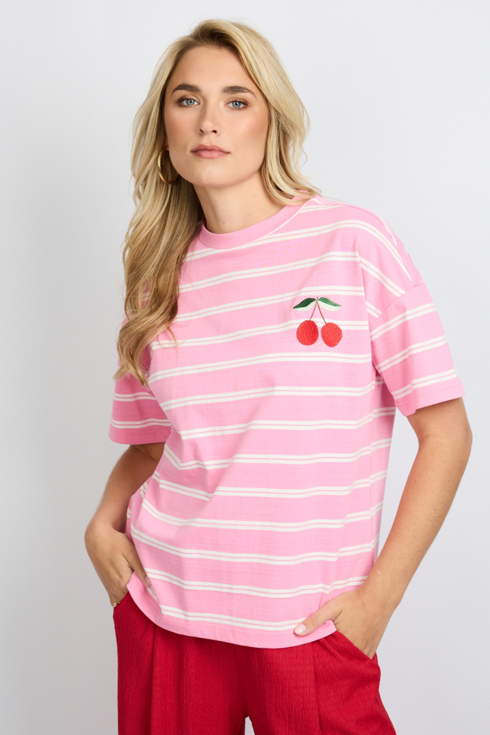 Dit casual T-shirt van Fluresk is een frisse aanvulling voor je lente garderobe. Met een klassieke ronde hals en korte mouwen, is dit T-shirt perfect voor een relaxte, dagelijkse look. De speelse fruitprint met kersen op een roze gestreepte achtergrond voegt een vrolijke en unieke touch toe. Gemaakt van 100% katoen, biedt het ademend comfort, ideaal voor de warmere dagen. De regular fit van het Fluresk T-shirt zorgt voor een comfortabele pasvorm die makkelijk te combineren is met je favoriete jeans of rok. De normale lengte maakt het veelzijdig in verschillende settings, van een casual dagje in het park tot een informele koffiedate. Dankzij het tijdloze ontwerp en de hoogwaardige materialen, is dit T-shirt een fantastische keuze voor elke dame die comfort en stijl wil combineren.