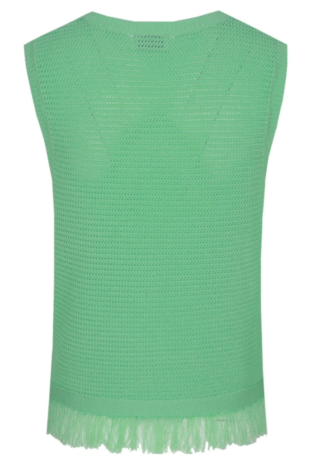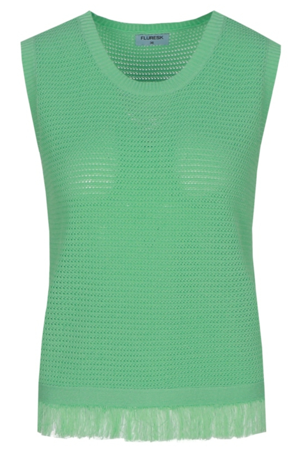 Deze stijlvolle groene knitwear top van Fluresk is een elegante aanvulling op je zomerse garderobe. Met een slim fit pasvorm biedt deze mouwloze top een flatterende look die perfect aansluit bij diverse gelegenheden. De ronde halslijn voegt een subtiel klassieke touch toe, terwijl het opengewerkte patroon je outfit een luchtige en moderne uitstraling geeft. De top is vervaardigd uit een mix van 60% polyester en 40% viscose, wat zorgt voor een comfortabele en duurzame draagervaring. Dankzij het speelse ontwerp met een lichte franjerand aan de onderkant, kun je deze Fluresk top veelzijdig combineren. Of je nu een casual dagje uit plant of een informeel feestje bezoekt, deze top is een ideale match met zowel jeans als rokken. Het normale lengteontwerp maakt hem gemakkelijk te dragen en zorgt ervoor dat je stijlvol blijft zonder in te boeten op comfort. Voeg deze veelzijdige top toe aan je collectie voor een moeiteloze zomerse look.