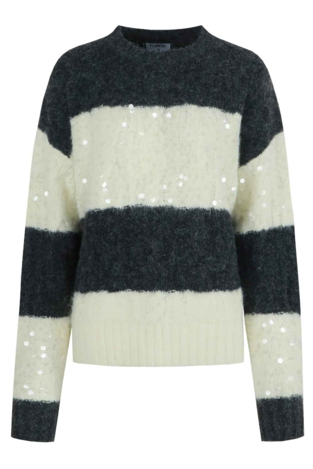 De Fluresk damestrui is een stijlvolle en comfortabele keuze voor de wintermaanden. Met een regular pasvorm en een ronde hals biedt deze trui zowel warmte als een moderne uitstraling. De combinatie van donkergrijze en crèmewitte strepen, afgewisseld met subtiele pailletten, maakt het een opvallend kledingstuk dat toch een tijdloze charme heeft. Dankzij de normale lengte en lange mouwen is deze trui perfect te dragen tijdens koudere dagen, zowel thuis als bij een informeel uitje. Gemaakt van zachte materialen, voel jij je heerlijk ingepakt in deze knitwear stijl. De speelse glinstering van de pailletten voegt een subtiele flair toe, waardoor de trui niet alleen geschikt is voor alledaagse draagmomenten, maar ook ideaal voor bijvoorbeeld een gezellige winteravond met vrienden. Combineer de Fluresk trui met een donkere jeans of een casual rok voor een complete look die zowel stijl als comfort uitstraalt.