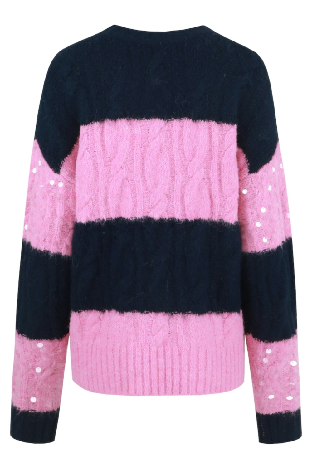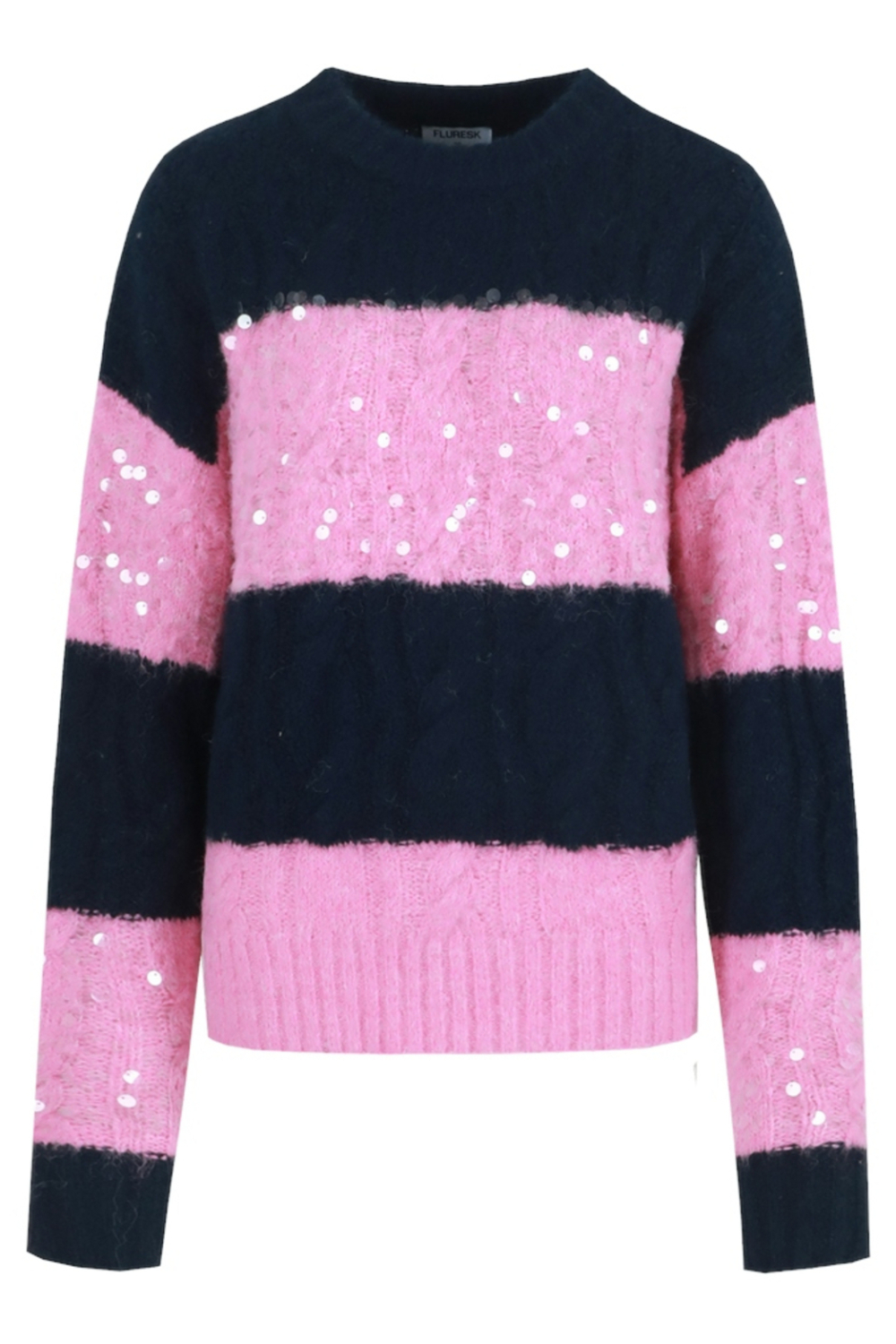 Deze opvallende trui van Fluresk is een perfecte keuze voor een stijlvolle winterlook. De trui heeft een opvallend patroon van navy en roze strepen, versierd met sprankelende pailletten die je outfit een speelse twist geven. Met een regular fit en lange mouwen biedt deze trui zowel comfort als warmte, ideaal voor de koudere dagen. De ronde hals voegt een klassieke touch toe, waardoor je deze trui makkelijk kunt combineren met zowel casual als meer geklede outfits. De Fluresk trui is gemaakt voor dames die houden van een mix van comfort en stijl. Door zijn normale lengte valt de trui mooi over een jeans of een nette broek, waardoor het een veelzijdig stuk is in je garderobe. Perfect voor een gezellige winterwandeling of een ontspannen dag thuis. De zachte, gebreide stof voelt heerlijk aan op de huid en de combinatie van kleur en textuur zorgt ervoor dat je met deze trui altijd goed voor de dag komt.