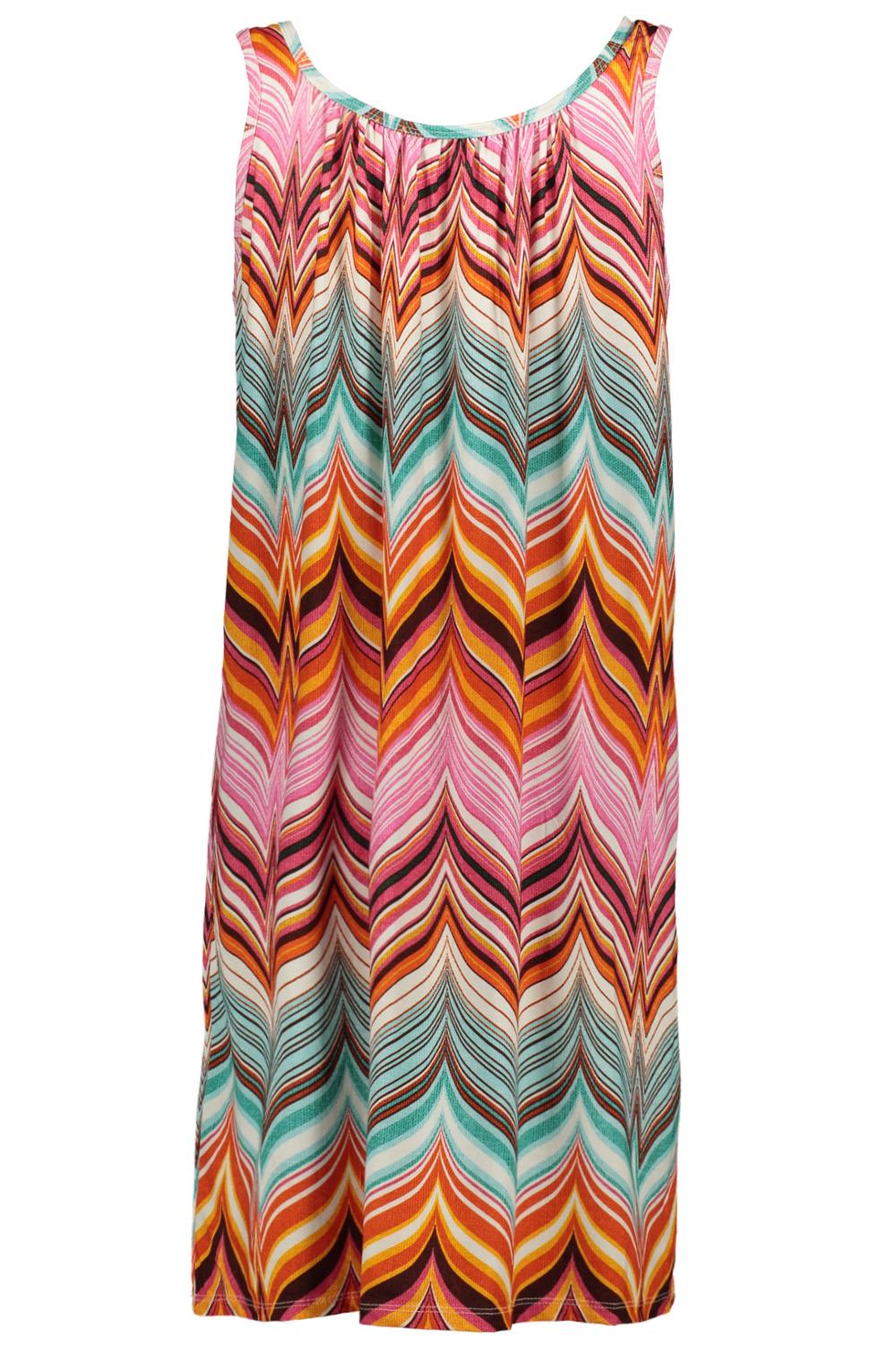 Met de halflange jurk van FOS Amsterdam voeg je een vleugje kleur toe aan je zomergarderobe. De grafische print in levendige fuchsia, oranje en turquoise tinten springt in het oog en biedt een verfrissende uitstraling voor warme dagen. Dankzij de ronde hals en mouwloze afwerking is deze jurk ideaal voor ontspannen stranddagen of een zomerse stadswandeling. Gemaakt van 95% viscose met 5% elastaan, biedt de stof een lichte en ademende pasvorm die soepel met je meebeweegt. De regular fit past comfortabel om je lichaam zonder te strak te zitten, waardoor je stijlvol en vrij kunt bewegen. Of je nu een middagje gaat shoppen, naar een festival gaat, of gewoon een relaxte dag aan zee doorbrengt, deze casual jurk is een veelzijdige keuze. Hij laat zich makkelijk combineren met sandalen of sneakers voor een nonchalante look. Met FOS Amsterdam kies je voor comfortabele mode zonder concessies te doen aan stijl. Meer informatie: Totale lengte is 94 cm bij maat S.