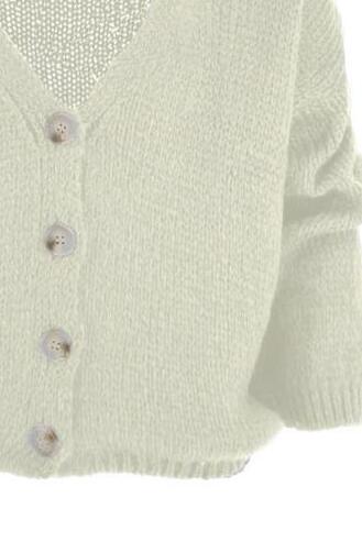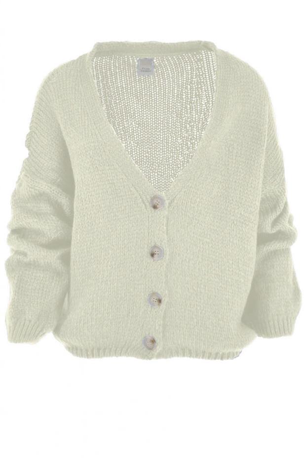 Gebreid vest van FOS Amsterdam met lange mouwen en een diepe v hals. Dit model sluit met hoornen knopen.