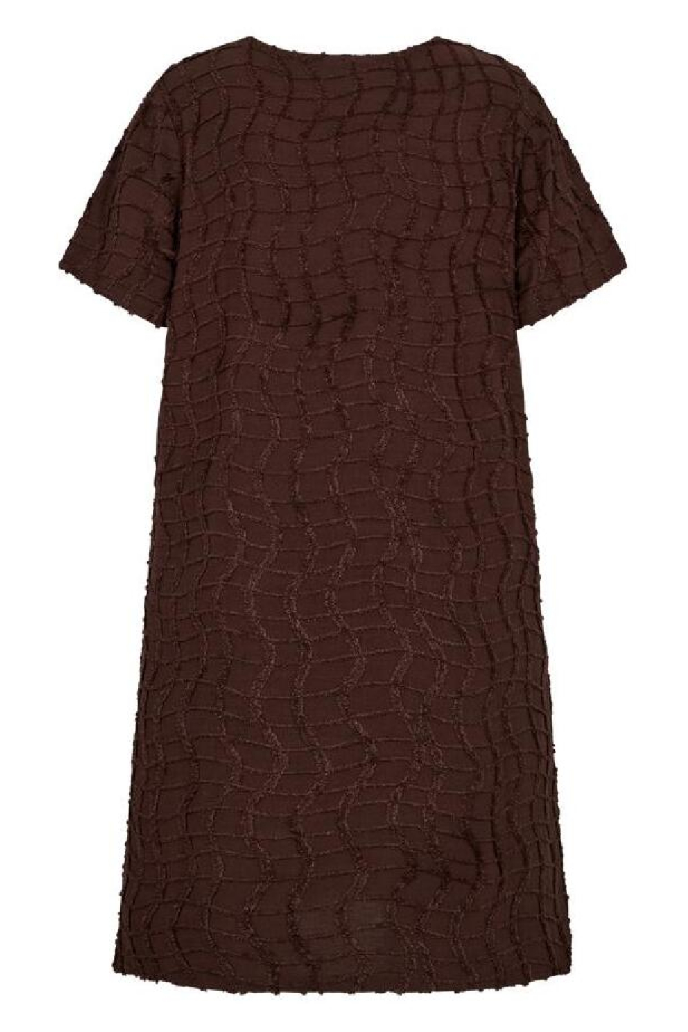 Deze prachtige jurk van Freequent komt in de warme tint 'coffee bean' en voegt een stijlvolle flair toe aan je zomergarderobe. Met een regular pasvorm en gemaakt van een mix van 65% polyester, 32% viscose en 3% elastaan, biedt deze jurk niet alleen een comfortabele maar ook een ademende ervaring. De gedetailleerde structuur van de stof geeft de jurk een bijzondere visuele textuur die opvalt, terwijl de ronde hals en korte mouwen zorgen voor een casual uitstraling die geschikt is voor verschillende gelegenheden. Dankzij zijn halflange lengte is deze kledingstuk ideaal te dragen bij zomerse uitstapjes of een informele bijeenkomst. Je kunt het moeiteloos combineren met sandalen voor een relaxte daguitstraling, of met hakken voor een iets chiquere look. De veelzijdigheid en het tijdloze ontwerp van deze Freequent jurk maken het een waardevolle aanvulling op je kledingkast, perfect voor zowel dagelijkse activiteiten als meer speciale gelegenheden waar je comfortabel en stijlvol wilt verschijnen. Meer informatie: De totale lengte is 95 cm bij maat S.
