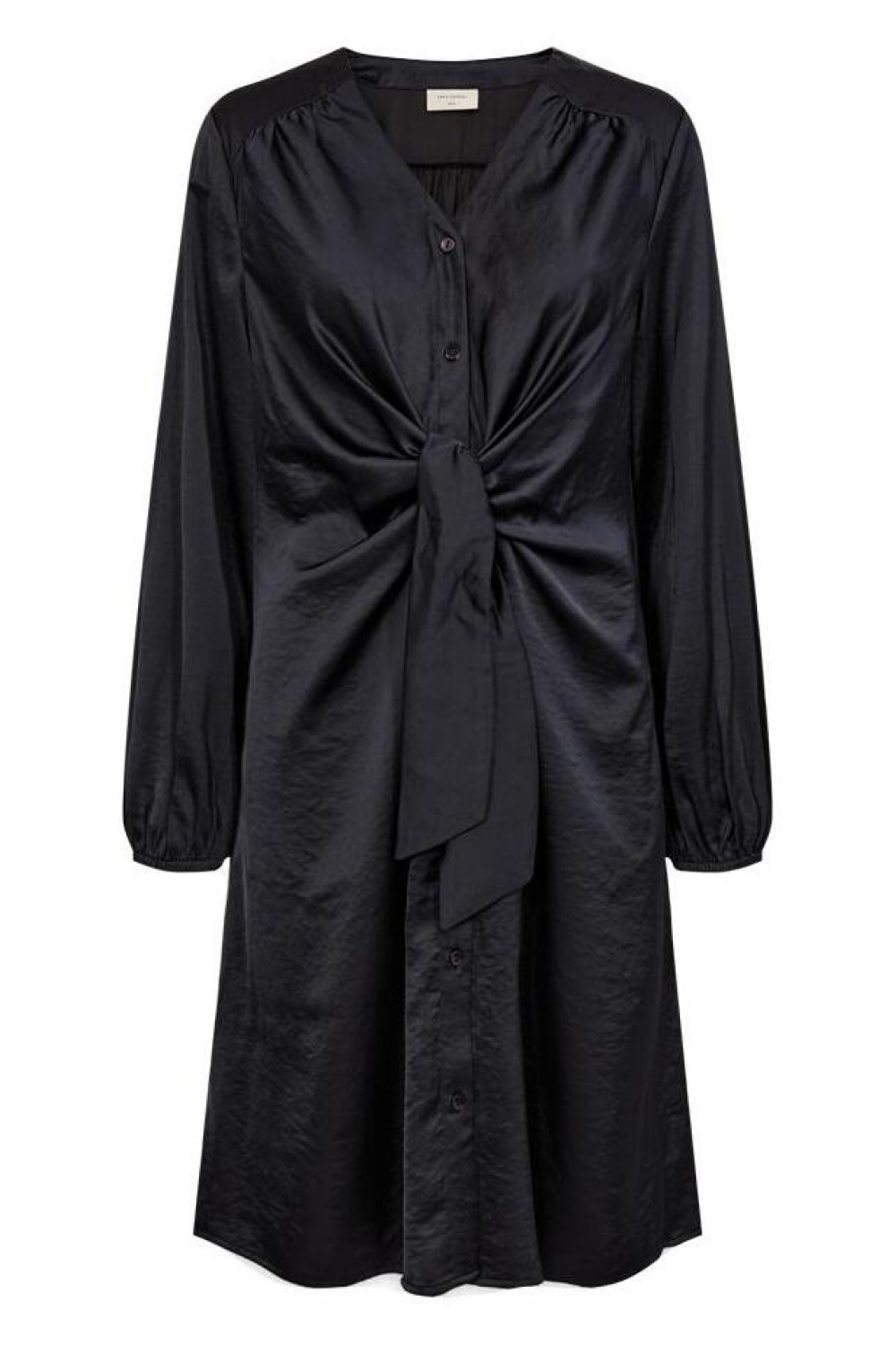 Deze zwarte jurk van Freequent is een stijlvolle en veelzijdige toevoeging aan jouw wintergarderobe. Gemaakt van een mix van 54% polyester en 46% viscose, biedt het een aangename draagervaring zonder in te boeten op stijl. De jurk heeft een regular fit waardoor hij comfortabel aanvoelt, maar tegelijkertijd zorgt de V-hals en de knoopsluiting voor een verfijnde uitstraling. De subtiele glans van de stof en de strikdetail aan de voorkant geven de jurk een elegante touch.