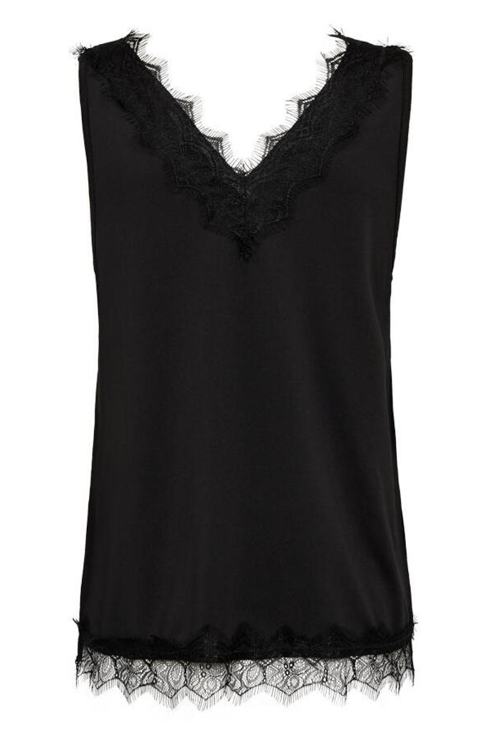 Deze elegante zwarte top van Freequent geeft jouw garderobe een stijlvolle boost. Het mouwloze ontwerp is perfect voor de winter, dankzij de combinatie van 95% polyester en 5% elastan, die zorgt voor een comfortabele pasvorm. De regular fit sluit mooi aan zonder in te leveren op bewegingsvrijheid, ideaal voor dagelijks gebruik of speciale gelegenheden. Het subtiele kantpatroon bij de V-hals en de onderkant van de top voegt een verfijnde touch toe die elke outfit naar een hoger niveau tilt.