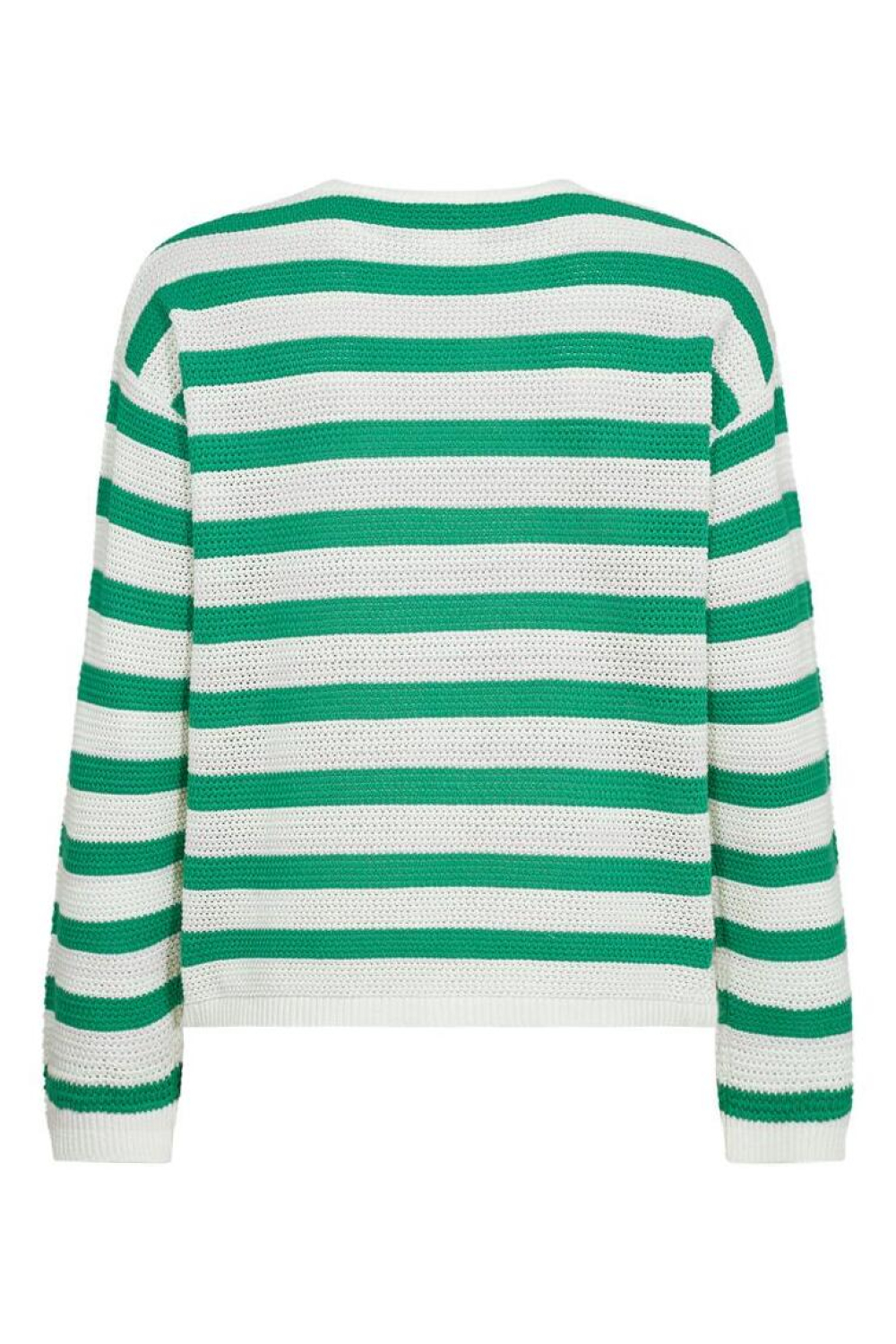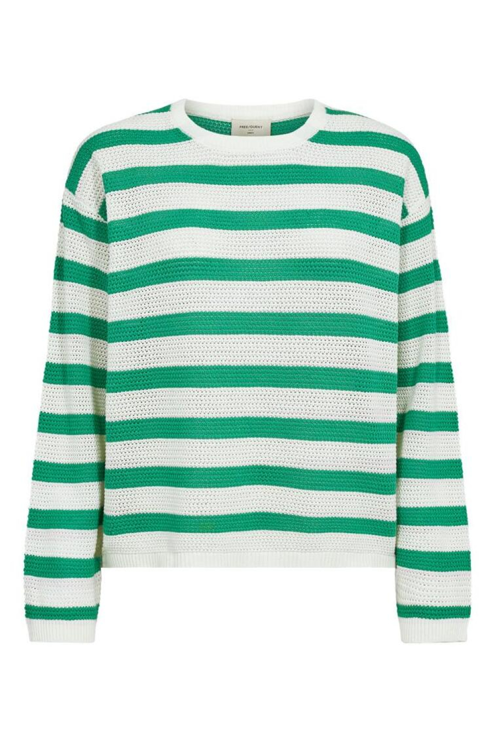 Deze groene en witte gestreepte trui van Freequent is een frisse toevoeging aan je lente-garderobe. De trui heeft een regular fit en is vervaardigd uit 100% katoen, wat zorgt voor een aangename en ademende kwaliteit. De ronde halslijn en lange mouwen maken het een comfortabel en veelzijdig kledingstuk. Het patroon van groen en wit biedt een speels en casual gevoel, ideaal voor dagelijkse uitstapjes of een relaxte dag thuis. Met zijn normale lengte en luchtige knitwear stijl, past de trui perfect bij een casual jeans of een lichte rok voor een eenvoudige maar stijlvolle look. Dankzij het duurzame materiaal kun je deze trui probleemloos dragen tijdens de koelere lentedagen. Of je nu een wandeling maakt in het park of een weekendje weg gaat, deze trui biedt de juiste balans tussen stijl en comfort.