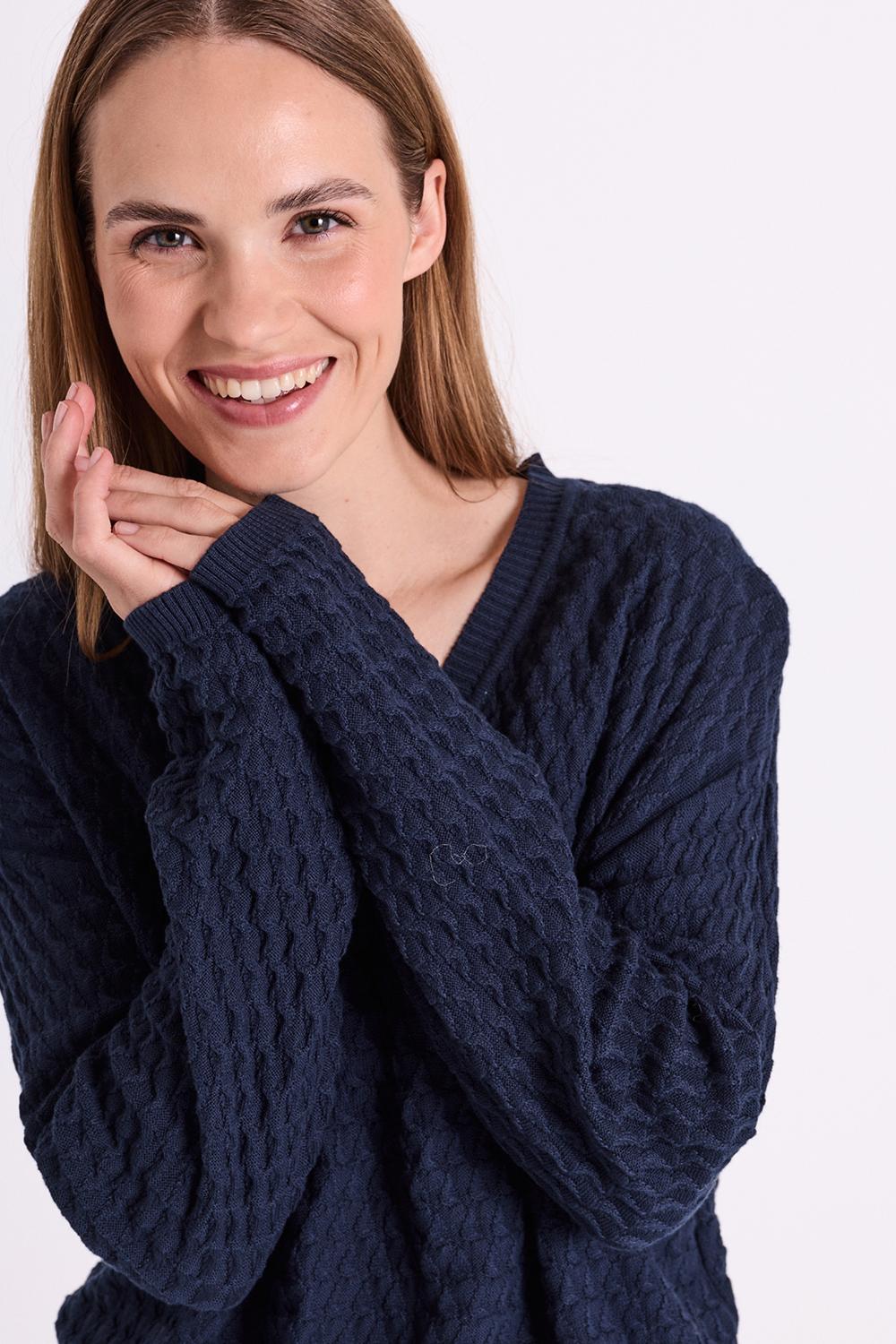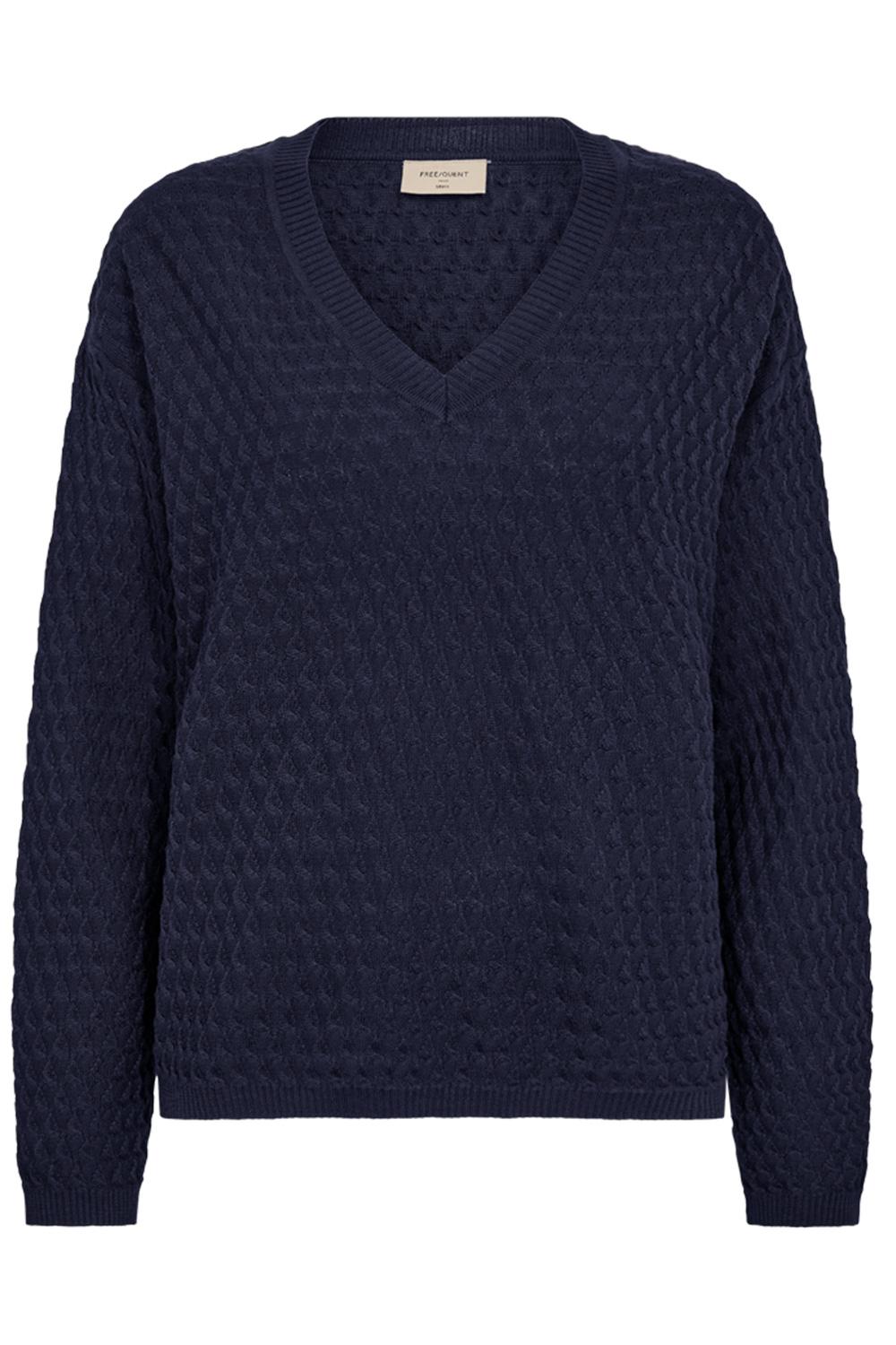 Deze navy blazer trui van Freequent biedt een stijlvolle aanvulling voor jouw wintergarderobe. Gemaakt van 100% organisch katoen, zorgt het voor een comfortabele en duurzame ervaring. De regular fit en de V-hals geven de trui een klassieke uitstraling, terwijl het structuurpatroon een subtiele flair toevoegt aan het ontwerp. Dit maakt het een ideale keuze voor diverse gelegenheden, van een ontspannen dag thuis tot een stijlvolle verschijning op kantoor. Met de normale lengte en lange mouwen is deze trui perfect voor de koudere maanden. Het navy blazer kleur past gemakkelijk bij verschillende stijlen, of je nu kiest voor een nette broek of een casual jeans. Door het ontbreken van zakken heeft de trui een gestroomlijnde look die niet alleen comfortabel maar ook gemakkelijk te combineren is. Of je nu binnen blijft of buiten een wandeling maakt, met deze knitwear stijl straal je altijd vertrouwen uit.