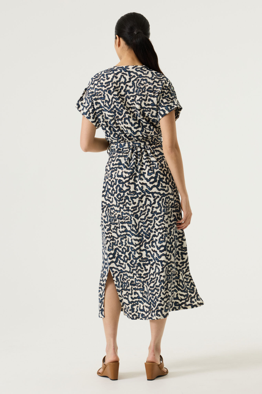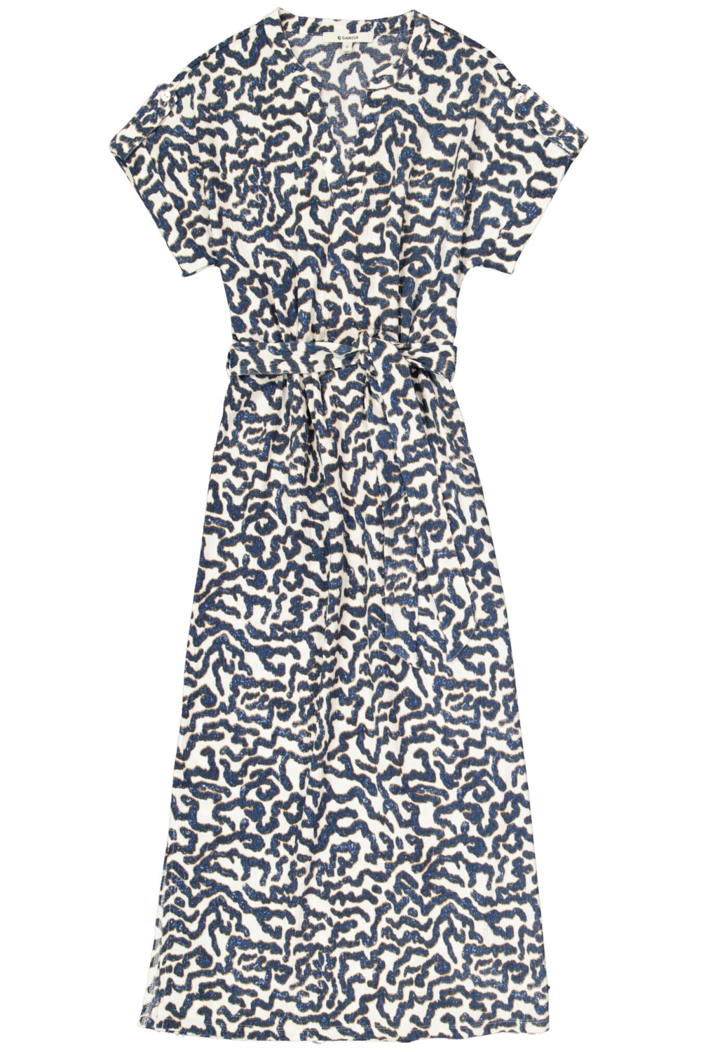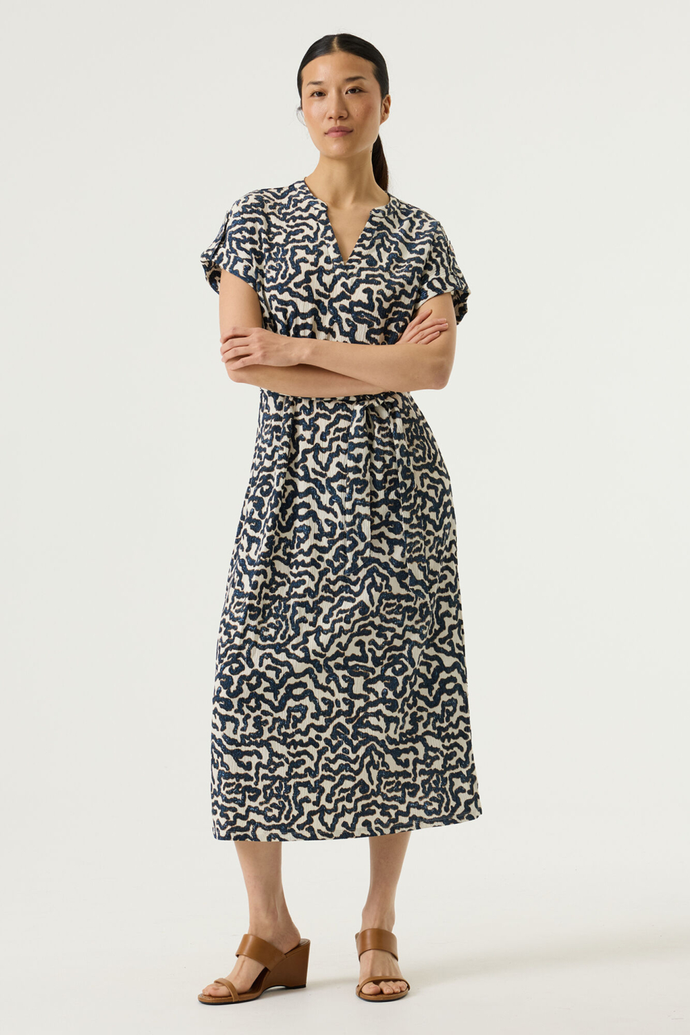 Deze stijlvolle Garcia jurk, gemaakt van 98% polyester en 2% elastan, is een perfecte aanvulling voor je lentegarderobe. Met een opvallend grafisch patroon combineert de jurk elegantie met een casual stijl. De V-hals en korte mouwen geven je een luchtige en comfortabele uitstraling, ideaal voor zowel een mooie lentedag als een gezellige avond met vrienden. De regular fit en de flatterende 7/8-lengte zorgen ervoor dat de jurk zich gemakkelijk aanpast aan elke situatie. De Garcia jurk zonder zakken en met een subtiele ceintuur rondom de taille geeft je figuur een mooie vorm en biedt een veelzijdige stylingoptie. Of je nu een dagje in de stad doorbrengt of een informele bijeenkomst bijwoont, deze jurk is een passende keuze. Combineer hem met sandalen voor een ontspannen look, of voeg een paar hakken toe voor een meer geklede uitstraling. Met zijn unieke ontwerp en comfortabele pasvorm, voegt deze jurk moeiteloos stijl toe aan je dagelijkse leven. Meer informatie: De totale lengte is 122 cm bij maat S.