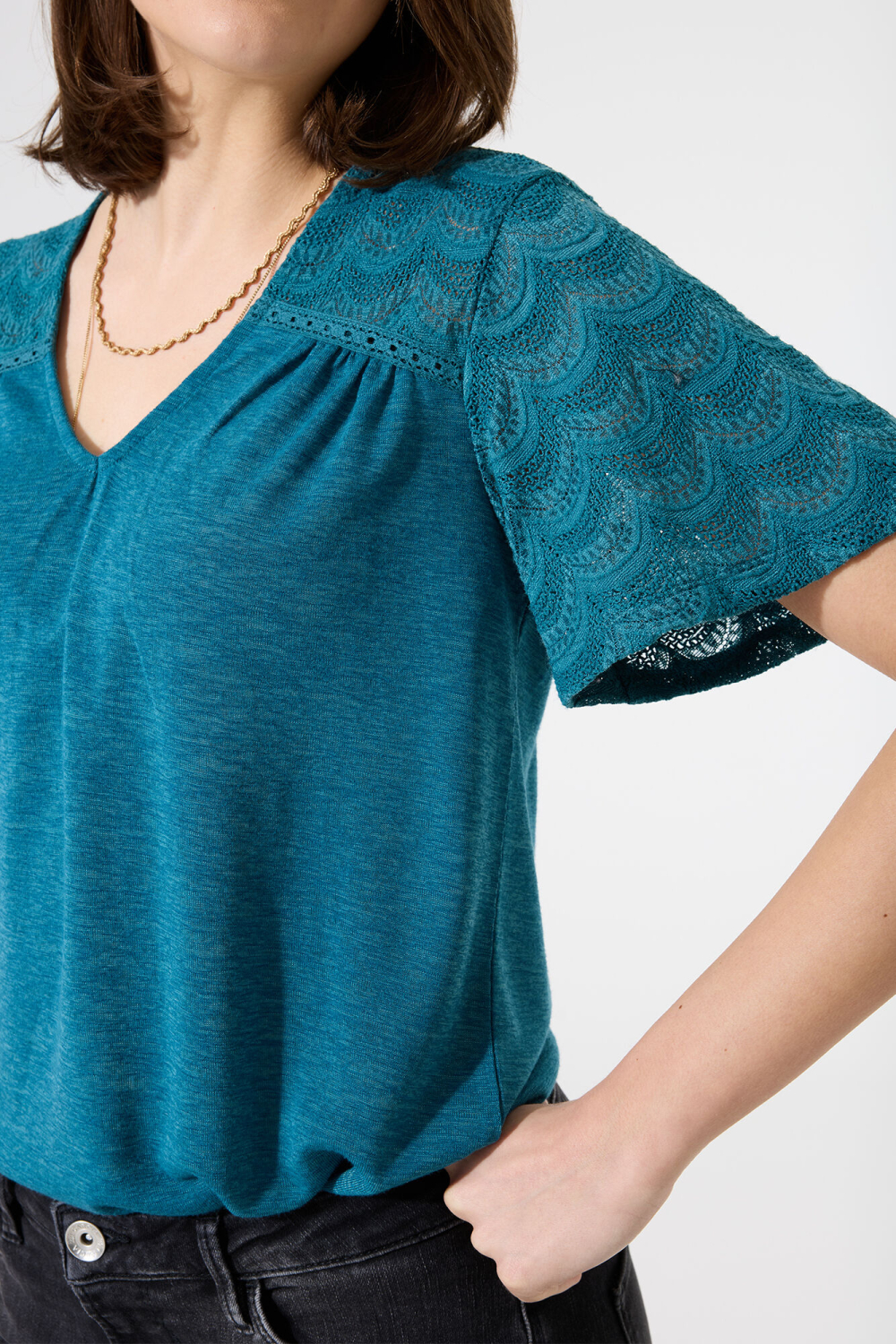 Het Garcia T-shirt voor dames is een ideale keuze voor je zomerse garderobe. Met een diepe 5079 Blue Lagoon kleur en een subtiel ajourpatroon op de korte mouwen, straalt dit T-shirt een casual elegantie uit. Gemaakt van 70% viscose en 30% polyester, biedt het een lichte en luchtige pasvorm die je koel houdt op warme dagen. De V-hals zorgt voor een flatterende en moderne uitstraling, terwijl de brede mouwen een speelse twist geven aan het geheel.