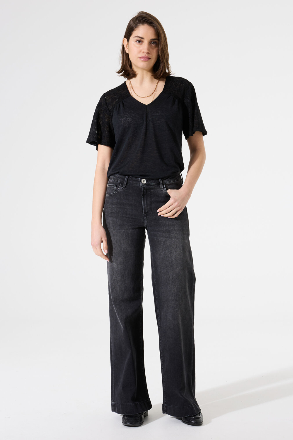 Dit zwarte dames T-shirt van Garcia is een elegante keuze voor de casual zomerlook. Het T-shirt is vervaardigd van 70% viscose en 30% polyester, wat zorgt voor een licht en ademend gevoel. De subtiele ajour details op de schouders en korte mouwen geven een verfijnde touch, terwijl de V-hals een vrouwelijke uitstraling biedt. De regular fit zorgt ervoor dat het shirt comfortabel om het lichaam valt, zonder in te boeten op stijl. Perfect voor een zonnige dag in het park of een ontspannen diner met vrienden. De veelzijdigheid van dit T-shirt is een groot pluspunt. Combineer het bijvoorbeeld met een lichte jeans voor een casual look, of met een rok voor een chique uitstraling. Dankzij de tijdloze kleur en het subtiele patroon kan het T-shirt makkelijk gecombineerd worden met diverse stijlen. Dit zomerse kledingstuk is een aanwinst voor elke damesgarderobe, ideaal voor uiteenlopende gelegenheden waarbij comfort en stijl hand in hand gaan.