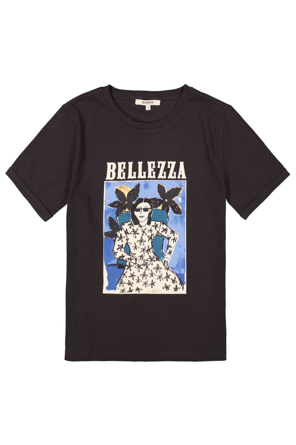 Dit casual T-shirt van Garcia is een veelzijdige aanvulling op je herfstgarderobe. Gemaakt van 100% katoen biedt het een comfortabele, ademende stof die ideaal is voor alledaags gebruik. Het T-shirt heeft een regular fit en een grafisch patroon dat opvalt door de opvallende print met het woord "Bellezza". De korte mouwen en ronde hals zorgen voor een relaxte uitstraling die bijdraagt aan je algehele comfort. De antraciete kleur in combinatie met de blauw-tinten in de print maakt dit T-shirt gemakkelijk te combineren met verschillende kledingstukken. Draag het met een jeans voor een casual dagje uit, of combineer het met een rok voor een speelse look. Dit duurzame stuk biedt een normale lengte die veelzijdig te stylen is, waardoor je het zowel thuis als onderweg probleemloos kunt dragen. Perfect voor een ontspannen dag of een informele bijeenkomst met vrienden.