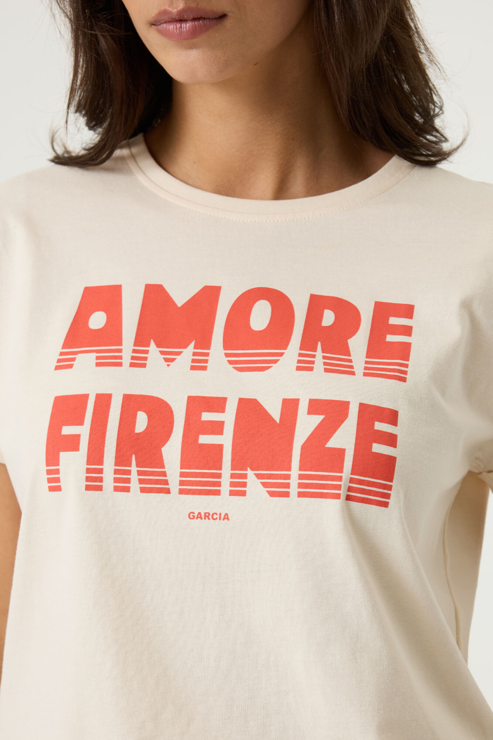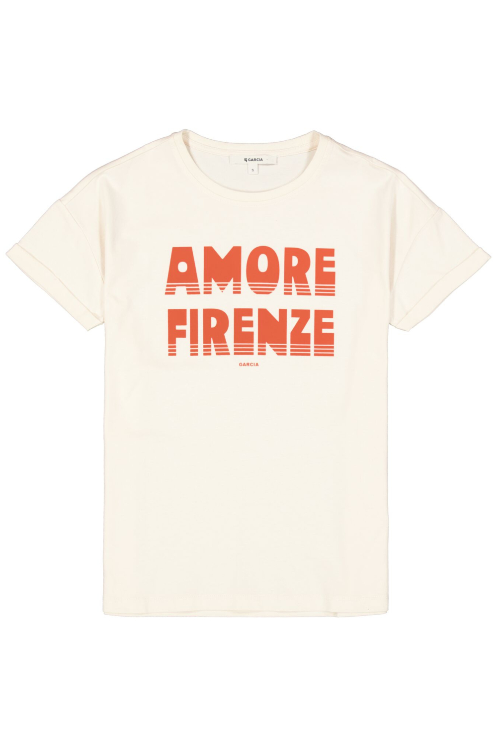 Dit casual dames T-shirt van Garcia is een perfecte keuze voor je lente garderobe. Gemaakt van 100% katoen, belooft het een zachte en comfortabele pasvorm die ideaal is voor dagelijkse uitstapjes. Het T-shirt komt in de frisse kleur 'Whitecap', en de opvallende rode tekst 'AMORE FIRENZE' op de voorkant zorgt voor een speelse uitstraling. De ronde halslijn en de korte mouwen maken dit T-shirt geschikt voor verschillende casual gelegenheden, of je nu een dagje de stad in gaat of een ontspannen middag in het park doorbrengt. Met zijn reguliere pasvorm biedt dit T-shirt zowel stijl als comfort. De normale lengte maakt het eenvoudig te combineren met je favoriete jeans of een luchtige rok, waardoor je een moeiteloze en toch modieuze look krijgt. Het tijdloze ontwerp en het comfortabele materiaal maken dit T-shirt van Garcia een veelzijdige aanvulling op elke casual garderobe. Ideaal voor de lente, waarbij je kunt genieten van zowel comfort als een vleugje Italiaanse flair in je outfit.