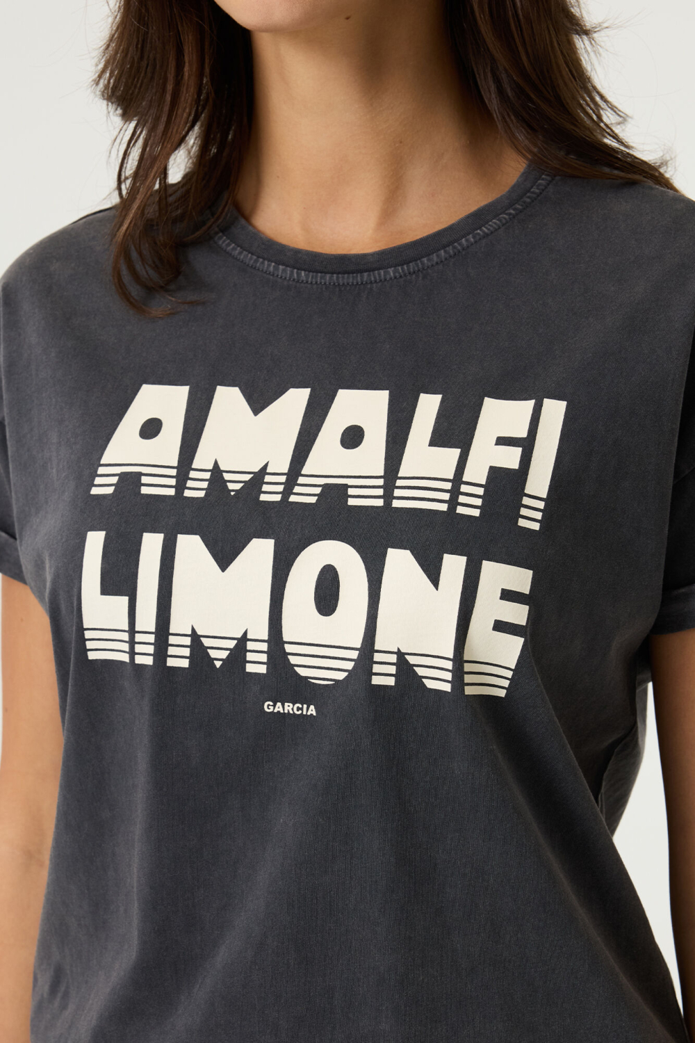 Dit casual dames T-shirt van Garcia geeft je garderobe een eigentijdse twist. Uitgevoerd in de kleur 62 antracite, biedt het T-shirt een opvallende tekstprint "AMALFI LIMONE" op de borst, die zorgt voor een speelse en moderne uitstraling. Gemaakt van 100% katoen, voelt het licht en comfortabel aan op de huid, ideaal voor de warme lentedagen. De ronde hals en de korte mouwen maken het perfect voor een relaxte dag thuis of een casual uitje met vrienden. Met zijn regular fit biedt het Garcia T-shirt een ontspannen pasvorm die bij verschillende lichaamstypes goed staat. De klassieke, maar trendy look past mooi bij een lichte jeans of een casual short, waarmee je moeiteloos een stijlvolle outfit creëert. Draag het tijdens een zonnige dag in het park of een middagje shoppen. Dit T-shirt is een veelzijdige aanvulling op elke casual garderobe en zorgt ervoor dat je met comfort en stijl voor de dag komt.
