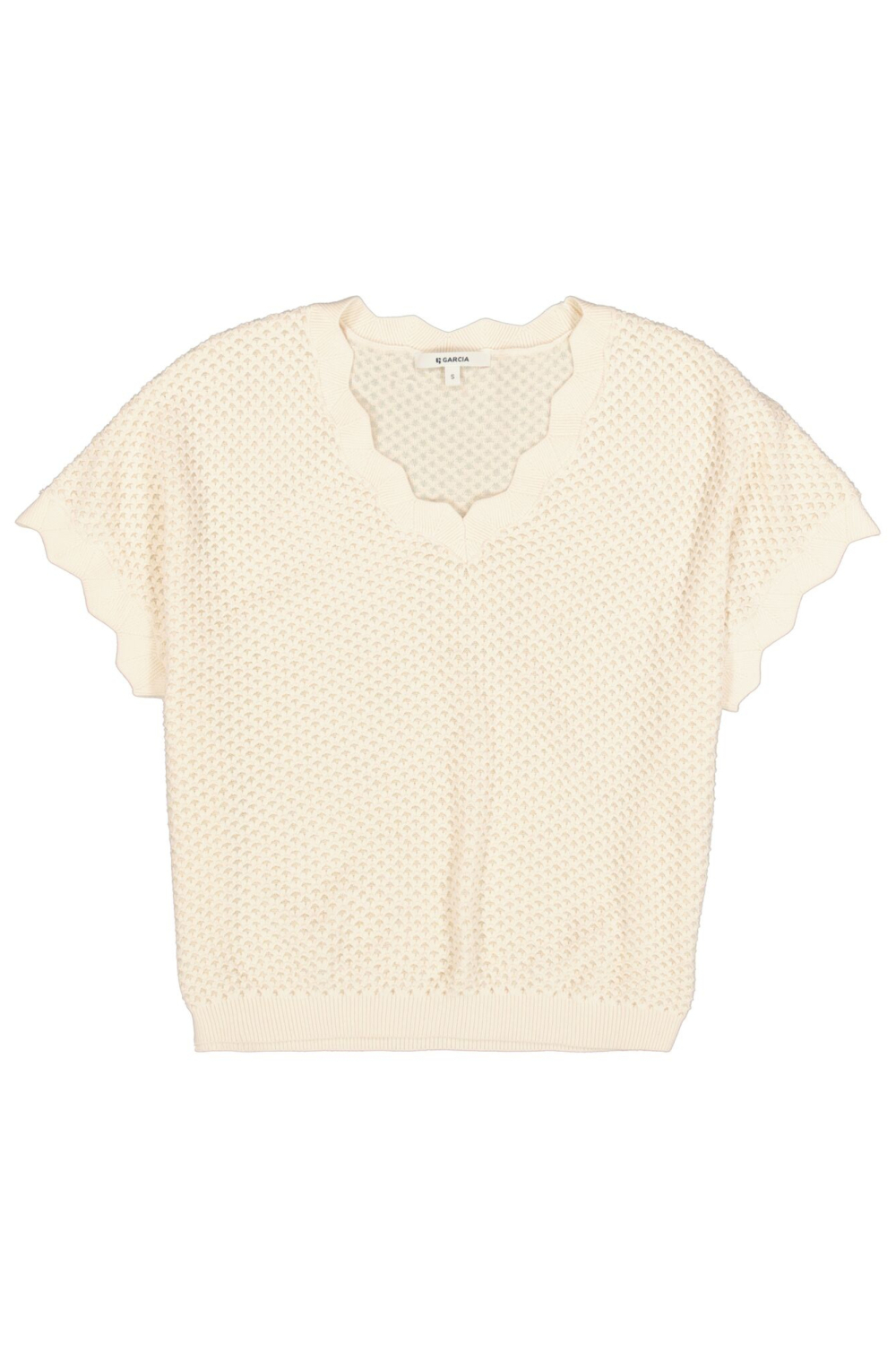 Deze elegante trui van Garcia combineert comfort en stijl op een subtiele manier. Met een verfijnde ajourpatroon en een frisse kleur '4294 Whitecap', geeft deze regular fit damestrui een luchtige uitstraling die perfect is voor de lente. De V-hals zorgt samen met de korte mouwen voor een casual, maar toch verzorgde look, waardoor je deze trui makkelijk kunt dragen tijdens zowel informele als iets formelere gelegenheden. Gemaakt van een zachte blend van 70% katoen en 30% viscose, voelt deze knitwear heerlijk aan op de huid. De normale lengte zorgt ervoor dat hij mooi valt en goed te combineren is met je favoriete jeans of een chique rok. Of je nu een dagje uit plant of een relaxte werkdag voor de boeg hebt, deze Garcia trui biedt je een stijlvolle en comfortabele keuze die je garderobe zal verrijken.