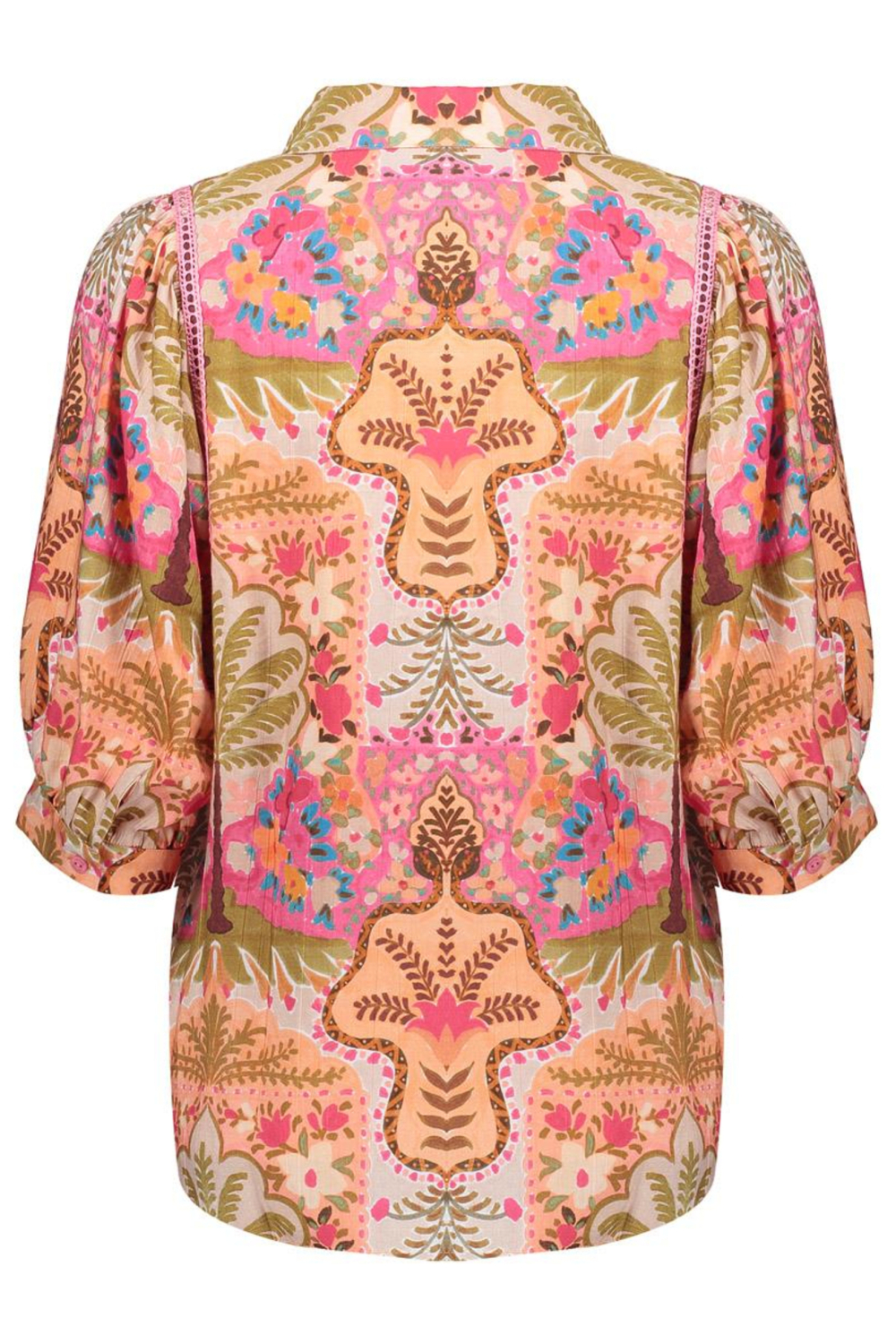 Deze kleurrijke damesblouse van Geisha is een opvallende toevoeging aan je garderobe. Het levendige patroon van bloemen is uitgevoerd in warme oranje, roze en groene tinten die perfect passen bij een casual stijl. De blouse heeft een puntkraag en een knoopsluiting, waardoor het een elegante maar ontspannen uitstraling heeft. De 3/4 mouwen zijn licht geplooid en geven een speelse touch aan het geheel. Gemaakt van 84% viscose en 16% polyamide, garandeert deze blouse comfort en ademend vermogen. De regular fit zorgt ervoor dat deze Geisha blouse je een fijne bewegingsvrijheid biedt, ideaal voor verschillende gelegenheden, van een informele werkdag tot een middagje shoppen met vriendinnen. De normale lengte maakt het eenvoudig te combineren met zowel een jeans als een nette broek. Dankzij het zomerse design is deze blouse een echte eyecatcher die jouw outfit een frisse uitstraling geeft. Of je nu naar een casual brunch gaat of een dagje uitstap plant, deze blouse is altijd een goede keus.