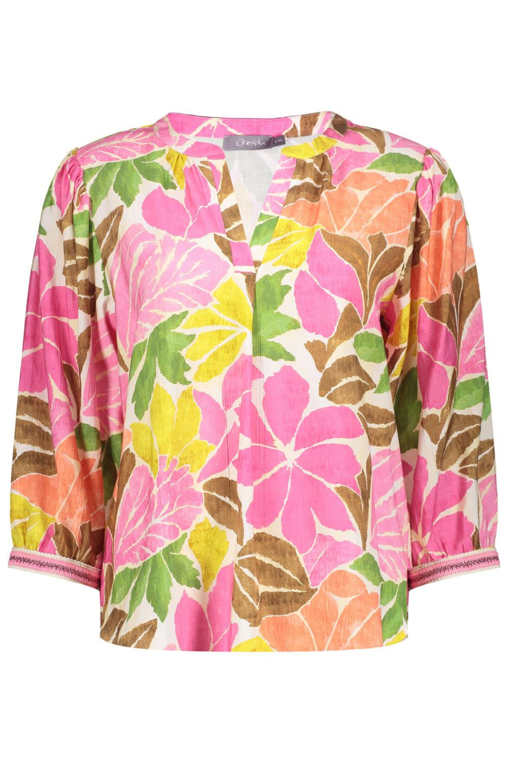 Deze kleurrijke damesblouse van Geisha biedt een frisse aanvulling op je lentegarderobe. Het opvallende bloemenpatroon in levendige tinten roze, groen en geel zorgt voor een speelse en moderne uitstraling. De regular fit pasvorm gecombineerd met de V-hals geeft een casual, maar verfijnde look. Gemaakt van 84% viscose en 16% polyamide, biedt deze top een lichte en comfortabele draagervaring, ideaal voor het voorjaar. De drie kwart mouwen zijn afgewerkt met een subtiel detail, wat de blouse een unieke touch geeft. Deze Geisha blouse is perfect voor diverse gelegenheden. Combineer hem met een nette broek voor een stijlvolle dag op het werk, of draag hem met een jeans voor een ontspannen middag met vrienden. Of je nu een brunch hebt of een wandeling maakt in het park, deze blouse past zich moeiteloos aan jouw agenda aan.