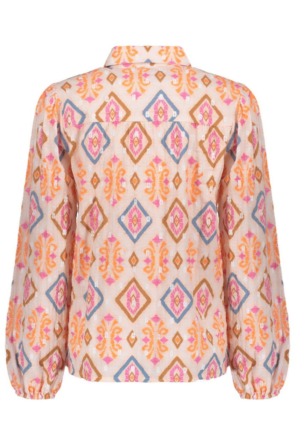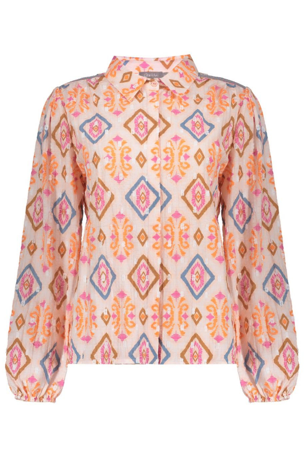 Deze Geisha damesblouse is een geweldige toevoeging aan je garderobe voor het lenteseizoen. Gemaakt van 100% katoen, voelt deze blouse licht en comfortabel aan op je huid. De regular fit biedt een luchtige pasvorm, ideaal voor dagelijks gebruik. De blouse heeft een levendig grafisch patroon met subtiele kleuren van oranje, roze en blauw, waardoor je een frisse en speelse look krijgt. Met de blinde knoopsluiting en de klassieke puntkraag blijft de uitstraling eenvoudig en stijlvol.