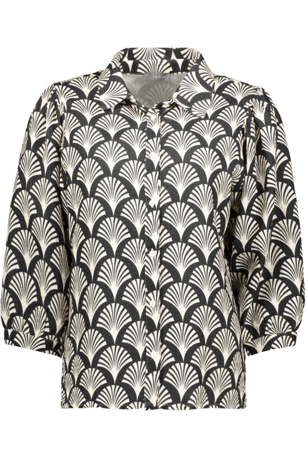 Deze Geisha damesblouse in de kleur ECRU/BLACK is een stijlvolle keuze voor een casual zomerdag. Gemaakt van een lichte mix van 55% viscose en 45% katoen, biedt de blouse zowel comfort als ademend vermogen. Het opvallende grafische patroon met een combinatie van ecru en zwart zorgt voor een eigentijdse look die je garderobe zeker zal opfleuren. De regular fit en de normale lengte maken het een veelzijdig item dat zowel bij een jeans als een nette broek gedragen kan worden. De blouse heeft een klassieke puntkraag en een knoopsluiting, wat bijdraagt aan een verfijnde uitstraling. Met mouwen tot 3/4 lengte is dit kledingstuk ideaal voor zomerse dagen of lenteavonden. De blouse is perfect voor informele bijeenkomsten, een dagje uit met vrienden of een ontspannen kantooromgeving. Het subtiele ontwerp en de comfortabele pasvorm maken het een must-have voor je zomergarderobe.