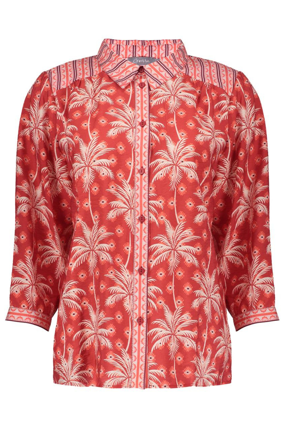 Deze charmante blouse van Geisha is een opvallend stuk voor elke lente- en zomergarderobe. De blouse heeft een energieke roodkleurige basis met een speels bloemenpatroon dat het geheel levendig maakt. Gemaakt van een zachte mix van 86% viscose en 14% polyamide, biedt deze blouse een comfortabele en ademende draagervaring. De regular fit en de 3/4 mouwlengte zorgen voor een ontspannen maar toch stijlvolle uitstraling, perfect voor casual dagen of een informele bijeenkomst. De blouse heeft een klassieke puntkraag en een knoopsluiting, wat bijdraagt aan de ingetogen elegantie. De contrasterende patronen op de schouders voegen een extra vleugje verfijning toe zonder overdreven te zijn. Of je nu een dagje uit plant, werkt vanuit huis, of vrienden ontmoet voor een gezellige lunch, deze Geisha blouse past zich moeiteloos aan jouw plannen aan. Combineer hem met een lichte jeans of een rok voor een frisse, zomerse look die altijd in de smaak valt.