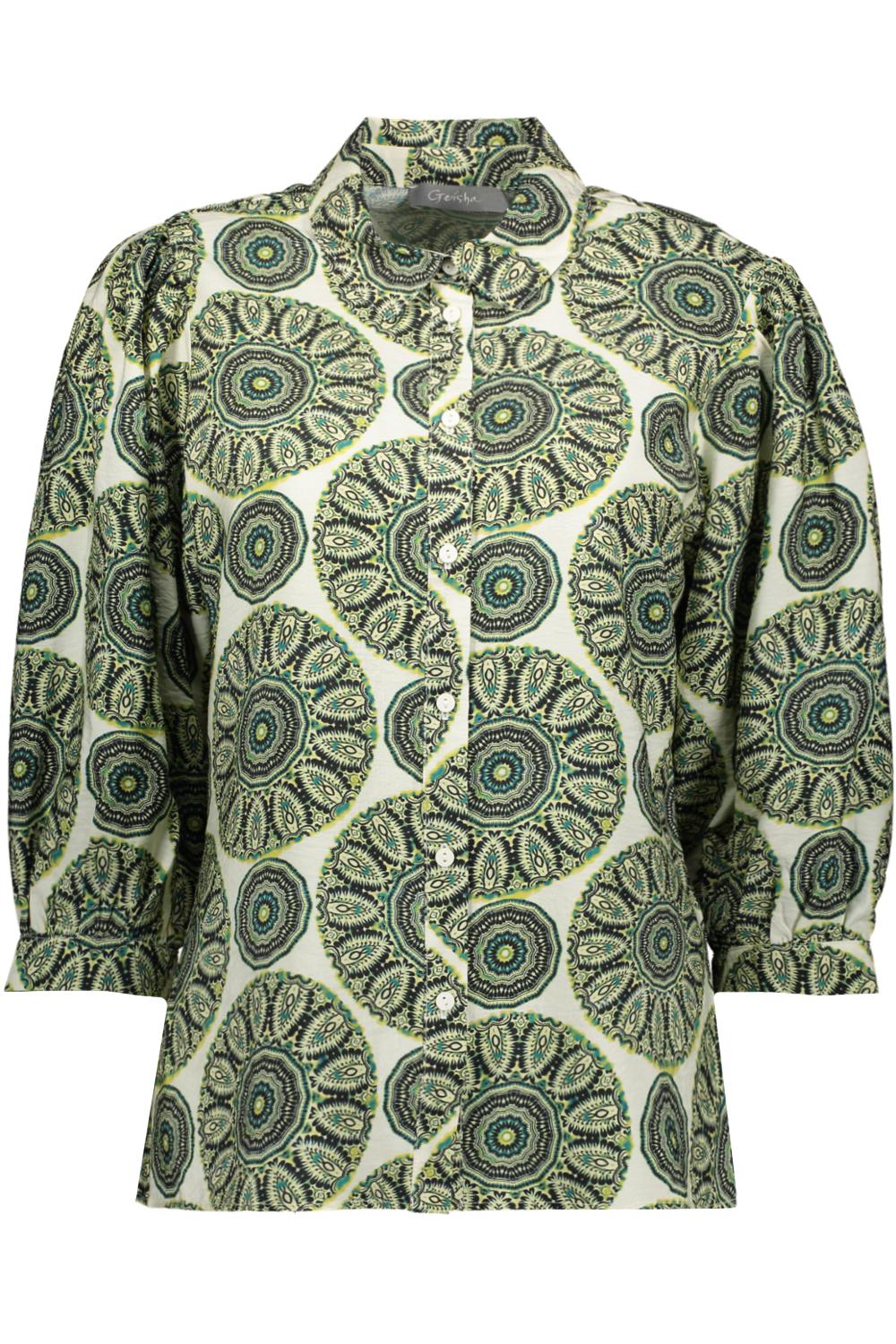 Deze elegante damesblouse van Geisha is een ideale aanvulling op je garderobe. Met zijn opvallende grafische patroon in groen- en blauwtonen voegt het een speelse touch toe aan je look. Gemaakt van hoogwaardige viscose en polyamide, biedt deze blouse een comfortabele en luchtige pasvorm. De regular fit en de klassieke puntkraag geven de blouse een tijdloze uitstraling. Dankzij de knoopsluiting is deze blouse zowel praktisch als stijlvol in gebruik. De 3/4 mouwen maken de blouse perfect voor het voorjaar, terwijl de normale lengte ervoor zorgt dat je hem gemakkelijk kunt combineren. Of je hem nu draagt naar een informele bijeenkomst of een casual dag op kantoor, deze blouse is veelzijdig inzetbaar. Combineer met een lichte jeans voor een ontspannen look, of kies voor een nette rok voor een meer formele stijl. Hoe je hem ook draagt, deze Geisha blouse is een prachtige keuze die balans biedt tussen comfort en stijl.