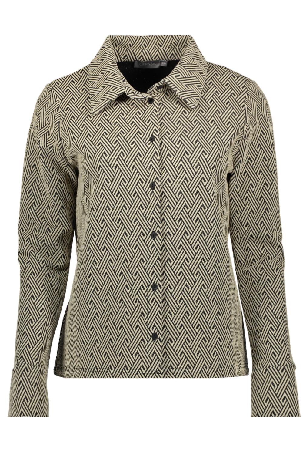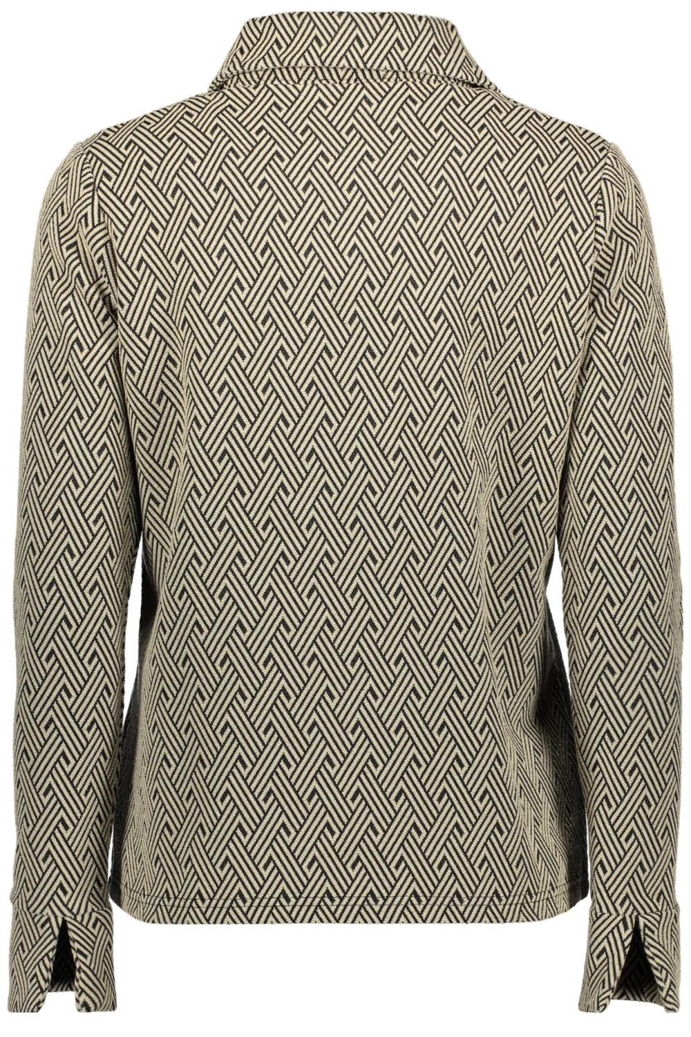 Blouse van Geisha met lange mouwen. Dit model heeft een puntkraag en sluit met een rij knopen. De blouse heeft een grafische print met een subtiele glitter.