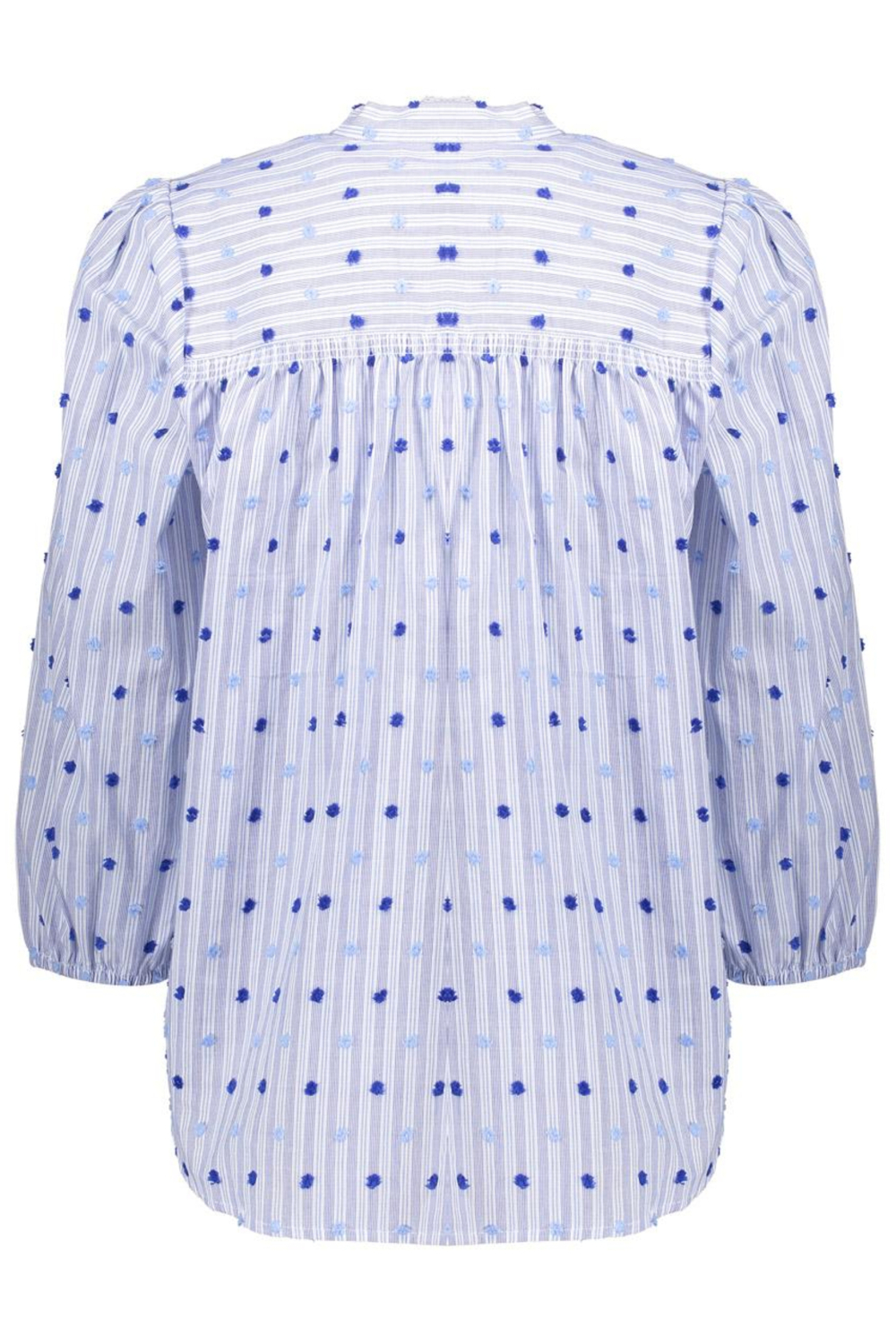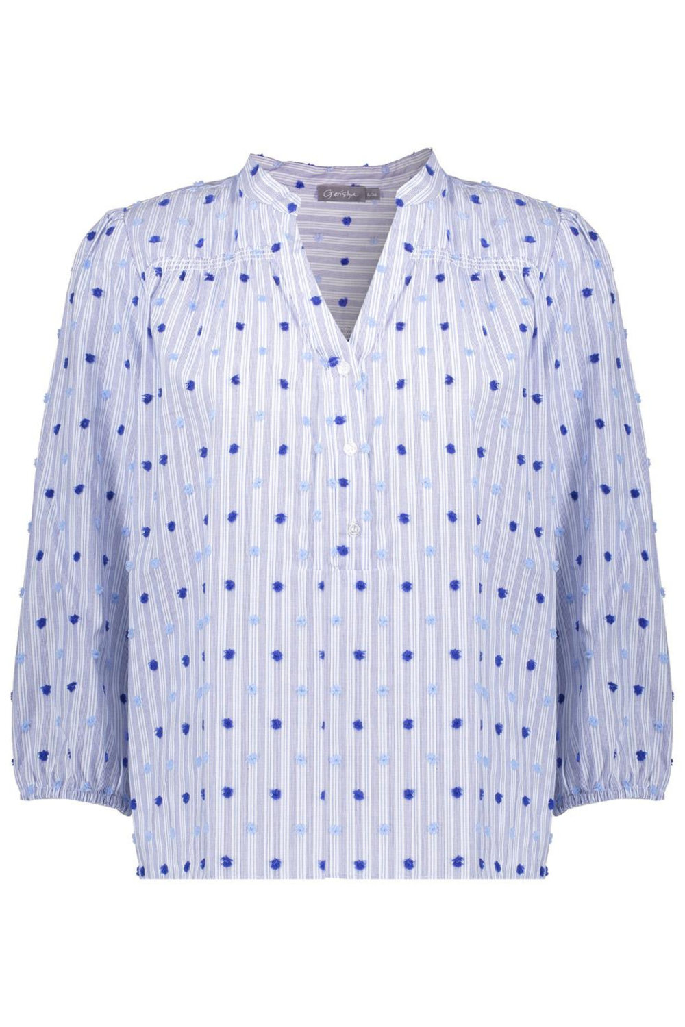 Deze stijlvolle damesblouse van Geisha is een tijdloze aanvulling voor je garderobe. Met zijn frisse streepjespatroon in blauw en subtiele details biedt deze blouse een casual en toch verfijnde uitstraling. De V-hals en knoopsluiting geven het een klassieke touch, terwijl de 3/4 mouwen het perfect maken voor de lente. Het gebruik van 100% katoen zorgt voor een comfortabele pasvorm die de hele dag door fijn aanvoelt. Dankzij het casual design van deze Geisha blouse kun je hem moeiteloos combineren met je favoriete jeans voor een ontspannen look, of stijlvol dragen onder een blazer voor een meer formele gelegenheid. De regular fit en normale lengte maken het een veelzijdig kledingstuk dat geschikt is voor zowel werk- als vrijetijdsactiviteiten. Of je nu op pad gaat voor een dagje winkelen of een informele avond met vrienden, met deze blouse ben je altijd goed gekleed.