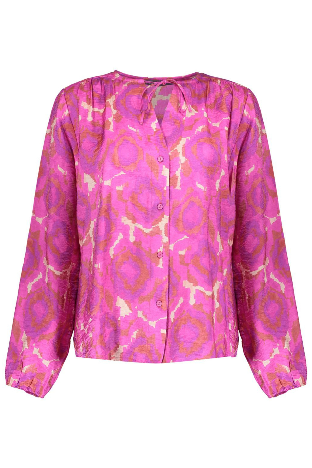 Deze kleurrijke damesblouse van Geisha is een stijlvolle toevoeging aan je najaarsgarderobe. Het grafische patroon in levendige roze en off-white tinten maakt deze blouse een opvallende keuze voor een casual dagje uit. De blouse is gemaakt van 100% viscose, wat zorgt voor een zachte en soepelvallende stof die comfortabel aanvoelt op de huid. Met een ronde hals en subtiele strikdetail, voegt het net dat beetje extra toe aan je outfit zonder overdadig te zijn.