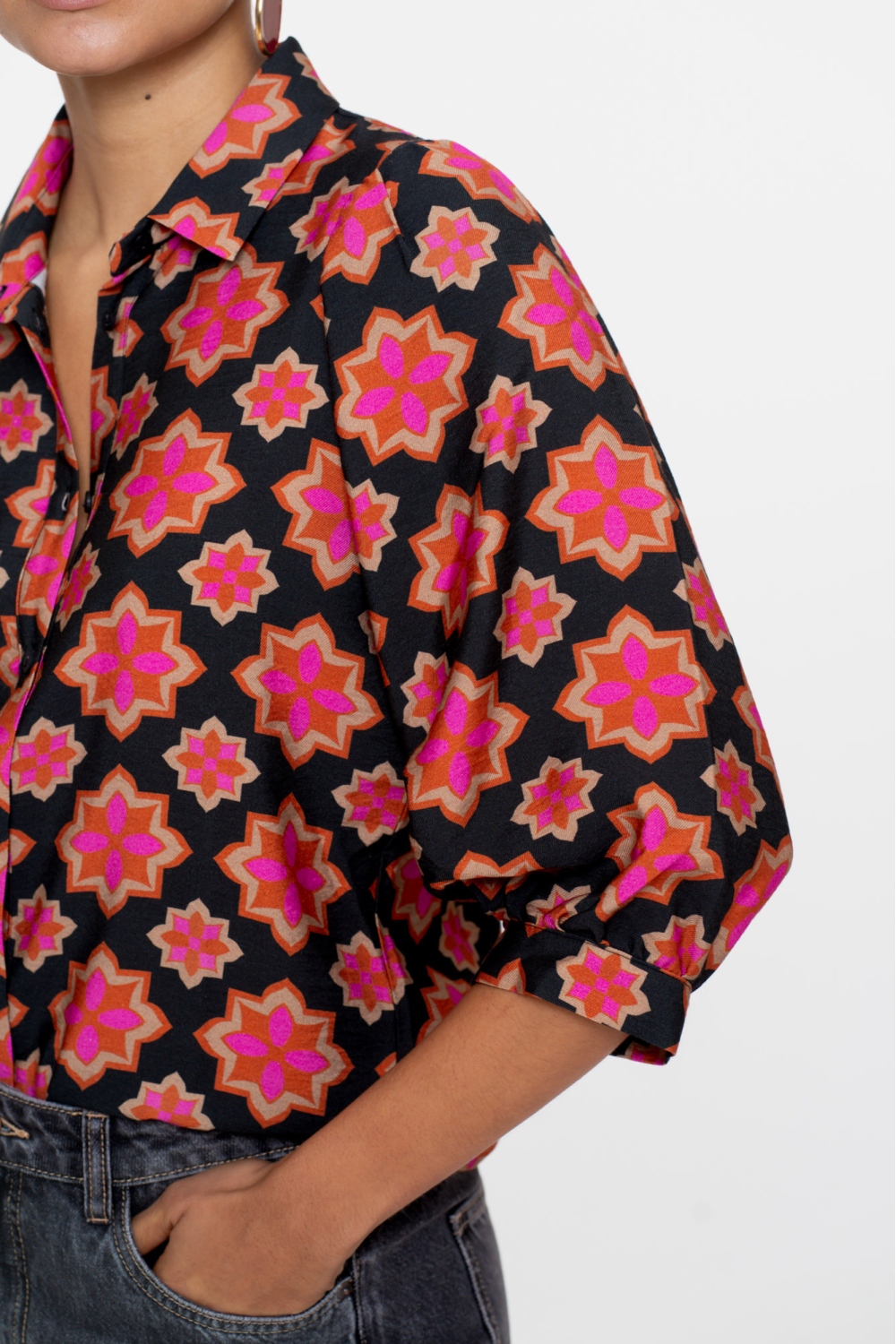 Deze Geisha dames blouse in BLACK/PINK is een kleurrijke toevoeging aan je casual garderobe. Met een opvallend grafisch patroon in roze en oranje tinten, zorgt deze regular fit blouse voor een frisse en levendige uitstraling. De blouse is gemaakt van 87% viscose en 13% polyamide, wat zorgt voor een heerlijk zachte en soepele stof. De puntkraag en knoopsluiting geven deze blouse een klassieke touch, terwijl de 3/4 mouwen een speelse look bieden. Dit maakt het de perfecte keuze voor een dagje uit of een informele bijeenkomst.