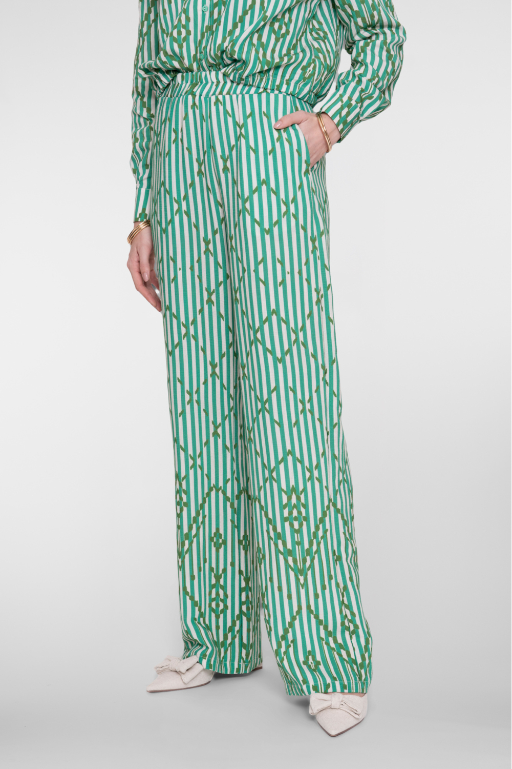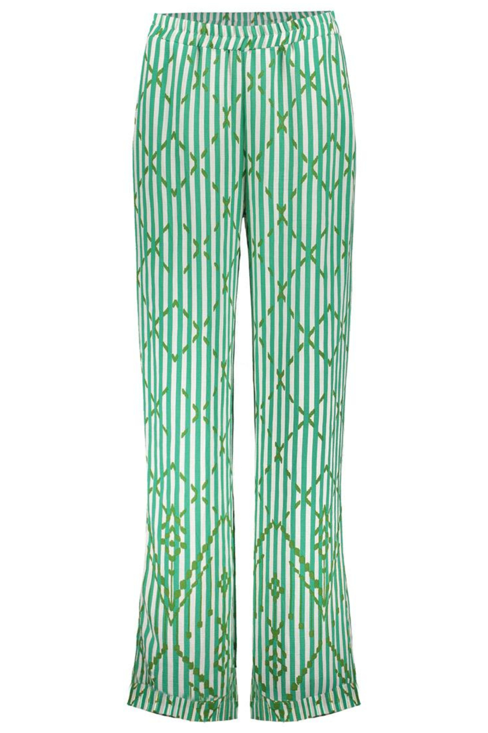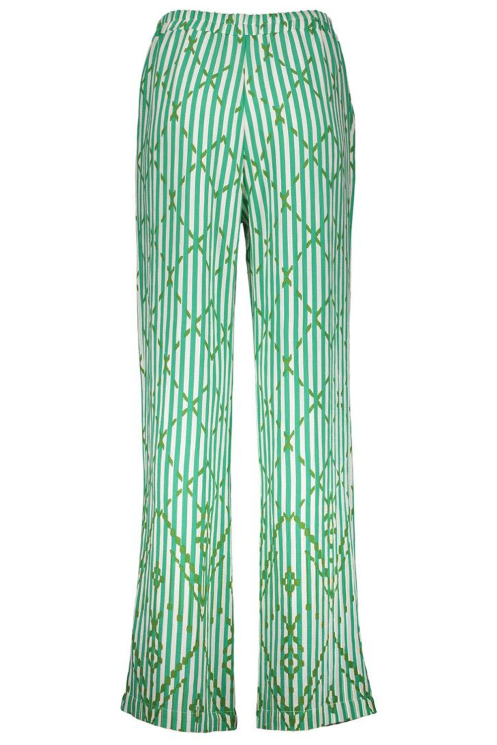 Deze groene streep broek van Geisha is een veelzijdige toevoeging aan je voorjaarsgarderobe. Het ontwerp met een elegante high waist en een comfortabele elastische boord zorgt voor een moeiteloze pasvorm. De stijlvolle wijde pijpen maken je look compleet en geven een moderne touch. De broek is vervaardigd van een zachte mix van 86% viscose en 14% polyamide, wat zorgt voor een vloeiende en ademende stof. Met subtiele groen-witte strepen en een ingeweven patroon krijgt deze broek een speelse en toch verfijnde uitstraling. Steekzakken voegen zowel stijl als functionaliteit toe aan dit kledingstuk.