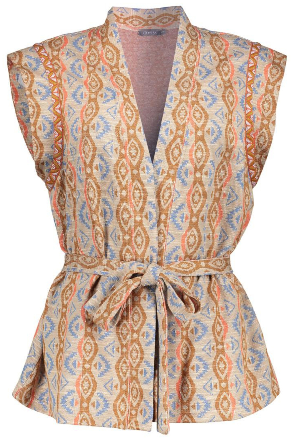 Dit kleurrijke geisha gilet combineert comfort met stijl. De speelse grafische patronen in aardetinten en subtiele blauwen geven het vest een unieke uitstraling. Door het strikkoord kun je de regular fit pasvorm eenvoudig aanpassen voor een flatterende look. Het mouwloze ontwerp maakt het perfect voor warme zomerdagen. Draag het over een eenvoudig T-shirt voor een casual uitstraling of combineer het met een blouse voor een meer gelaagde outfit. De veelzijdigheid van dit Geisha gilet maakt het een ideale keuze voor verschillende gelegenheden. Of je nu een dagje uit plant in de stad of een ontspannen middag in de tuin doorbrengt, dit gilet biedt altijd een stijlvolle touch. De normale lengte zorgt ervoor dat het gemakkelijk te combineren is met zowel broeken als rokken. Dankzij de luchtige stof en het creatieve ontwerp blijf je comfortabel terwijl je je persoonlijke stijl uitdrukt.