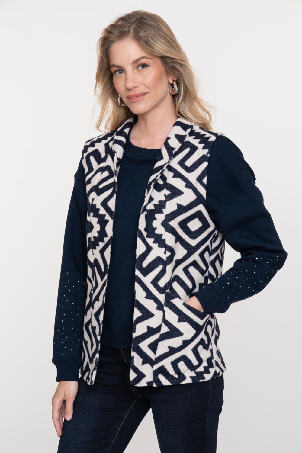 Dit damesgilet van Geisha is een stijlvolle toevoeging aan je wintergarderobe. Het gilet heeft een opvallend grafisch patroon in navy en off-white, wat zorgt voor een modieuze look. Gemaakt van een comfortabele mix van 84% polyester en 16% katoen, biedt het de ideale balans tussen warmte en draagcomfort. De regular fit en normale lengte maken het gilet perfect voor een casual setting. Of je nu een dag op kantoor hebt of een informele bijeenkomst plant, dit gilet past zich moeiteloos aan aan jouw stijl. De praktische steekzakken aan de voorzijde voegen zowel functionaliteit als flair toe. Combineer het gilet met een donkere jeans of een eenvoudige top voor een compleet en moeiteloos ensemble. De mouwloze constructie maakt gelaagdheid eenvoudig zonder afbreuk te doen aan je bewegingsvrijheid. Dankzij het veelzijdige ontwerp kun je het gilet gemakkelijk in verschillende gelegenheden dragen, waardoor het een onmisbaar item is in je dagelijkse kledingselectie.